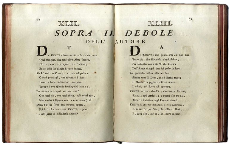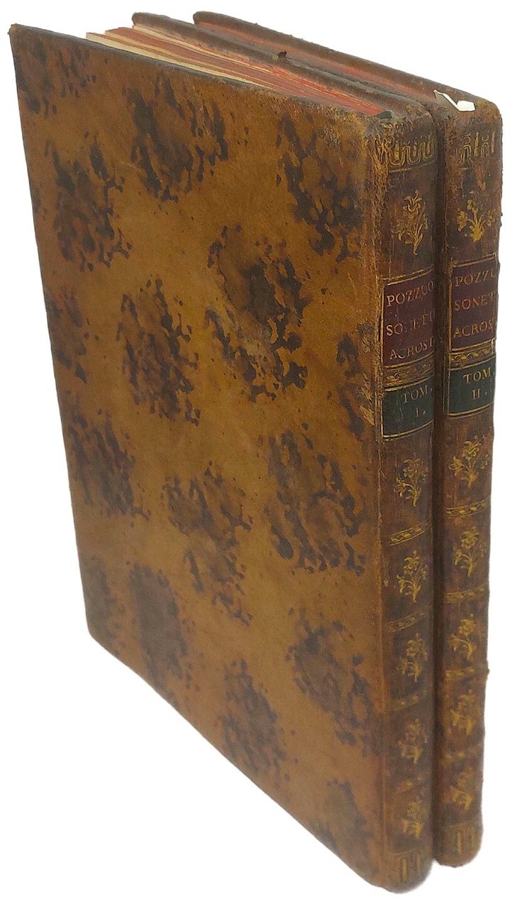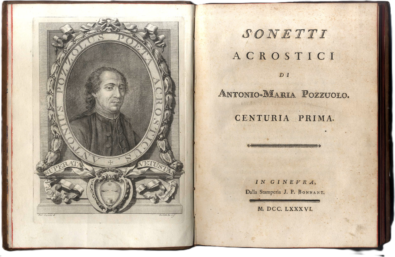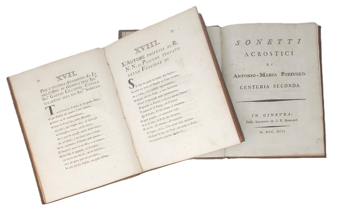 >Due volumi in-4, pp.134, 132, al primo volume bel ritratto dell'Autore disegnato da Capurro e inciso da Guidotti. Legature in piena pelle marezzata fregi e titoli in oro su tasselli, tagli rossi. Bellissimo esemplare su carta forte ad ampi margini. Gli acrostici della prima centuria sono spesso indirizzati a monarchi europei o altri personaggi celebri; quelli del secondo volume sono perlopiù rivolti a personaggi dell'area ligure e genovese. Non mancano diversi omaggi alla gastronomia: divertente il sonetto dedicato al noto piatto ligure:" Di troffie il mio palato arde e non cura tutto ciò che il budello altrui seduce...", quello "Sopra il Buon Vino d'Orero" che elogia la Malvasia (centuria seconda) e il Panegirico alla Regina delle Minestre, in lode de ravioli (centuria prima). Prima edizione rara a reperirsi completa del secondo volume (stampato qualche anno dopo).