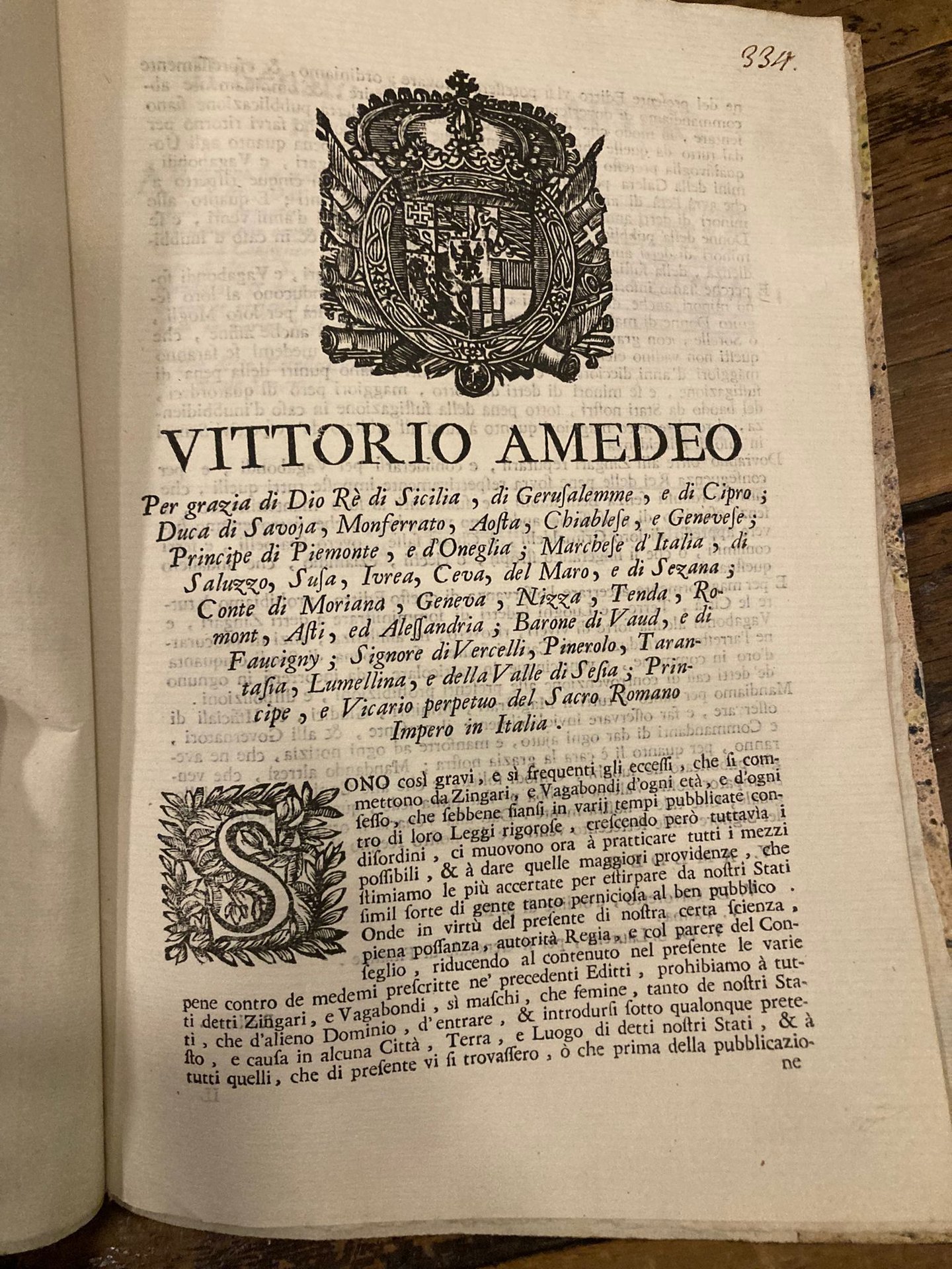 In-4° (28x20 cm), pp. (2) bianche, 4, (2) bianche, brossura coeva muta in carta policroma. Stemma dei Savoia in testata e capolettera incisi. Ottimo esemplare. Non comune editto limitante le libertà di zingari, vagabondi e ciarlatani pronunciato indi firmato alla Venaria Reale da Vittorio Amedeo e funzionari il 20 ottobre 1720.