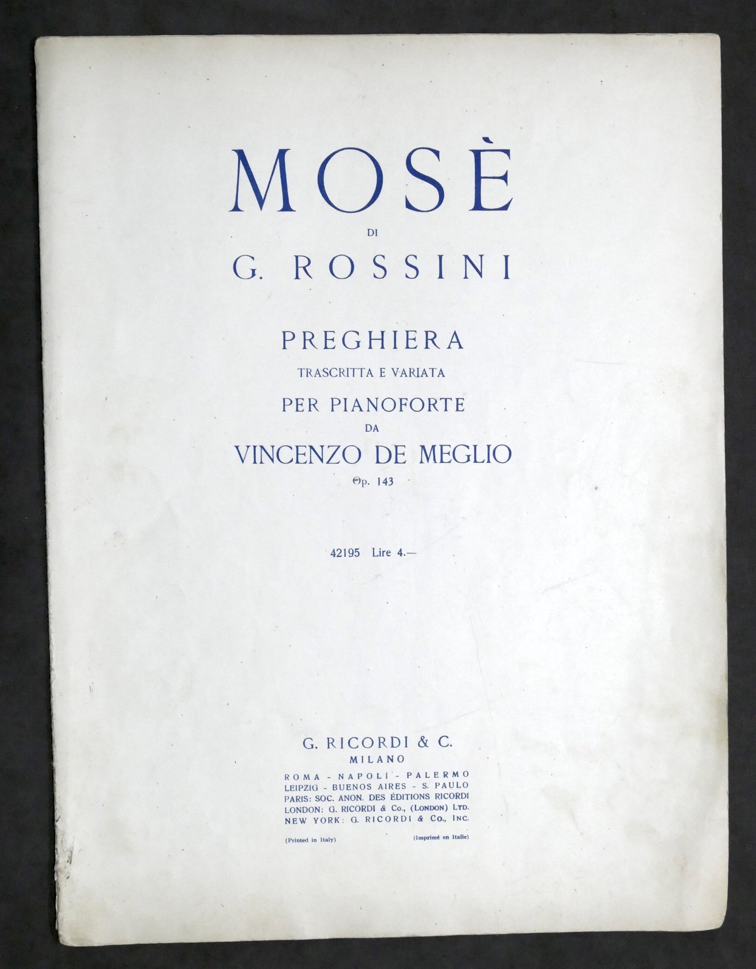 Spartito - Mosè di G. Rossini - Preghiera trascritta e variata per pianoforte da Vincenzo De Meglio - Op. 143 - ed. 1920 ca. Ricordi Pag. 9 - F.G. Copertina morbida. Condizioni buone.