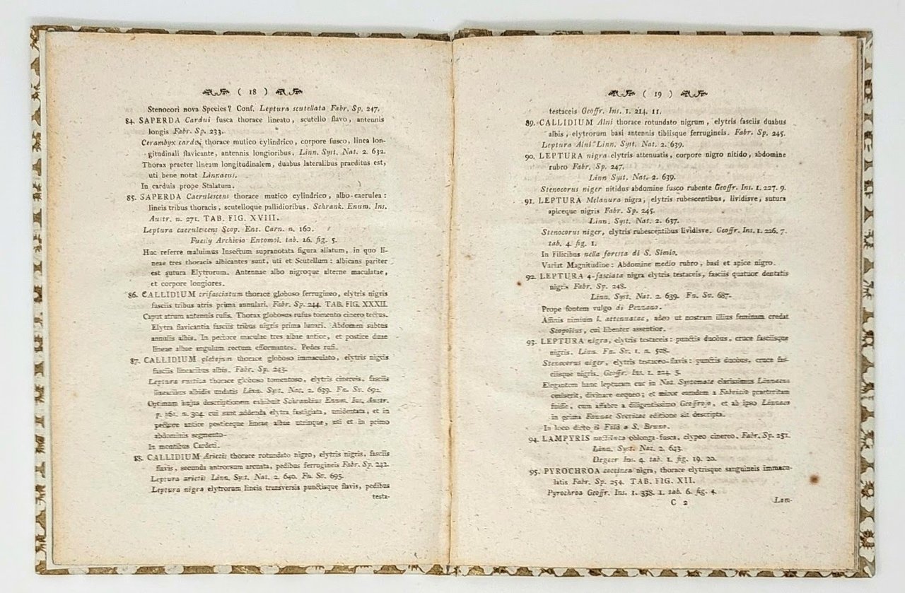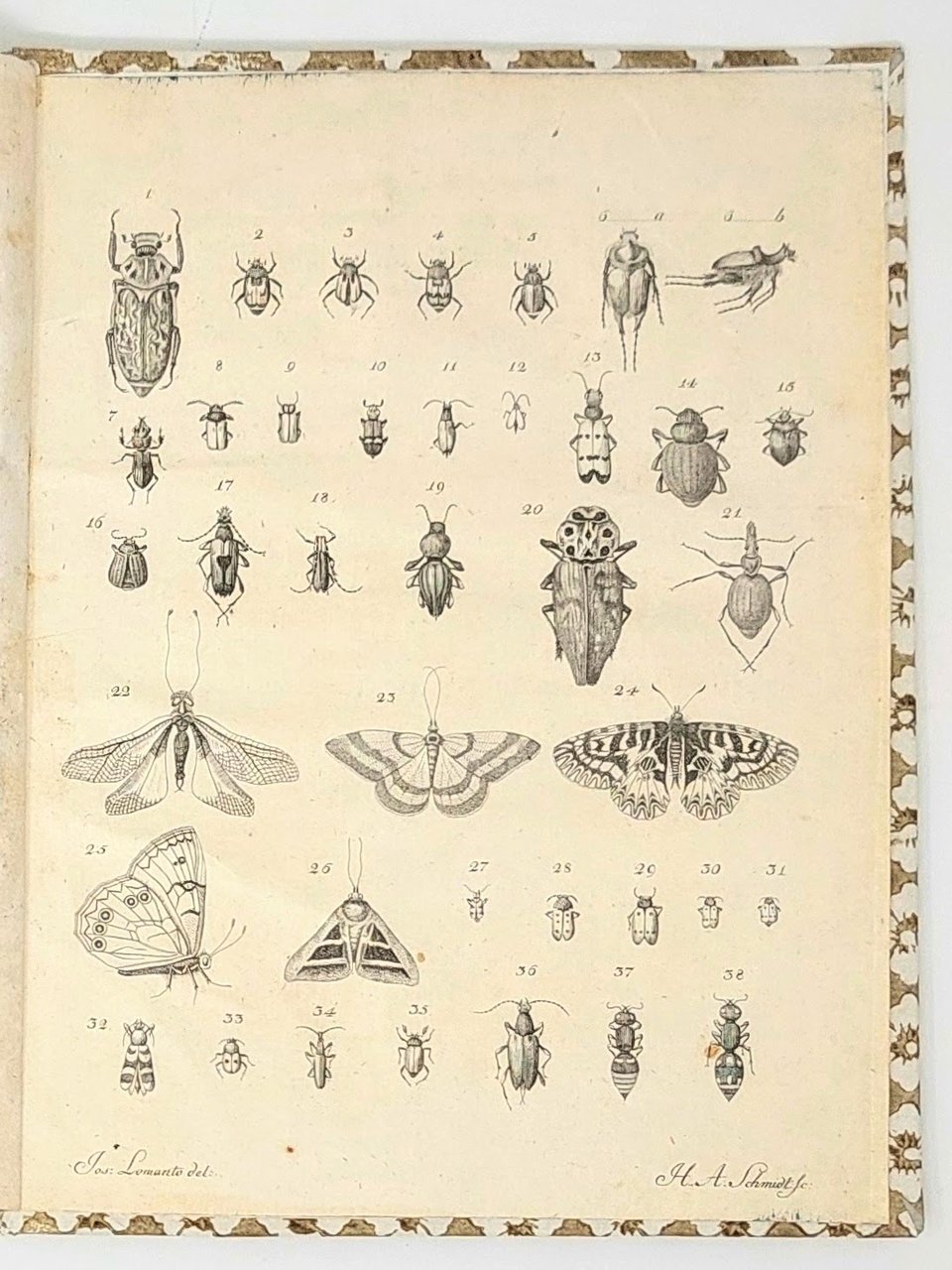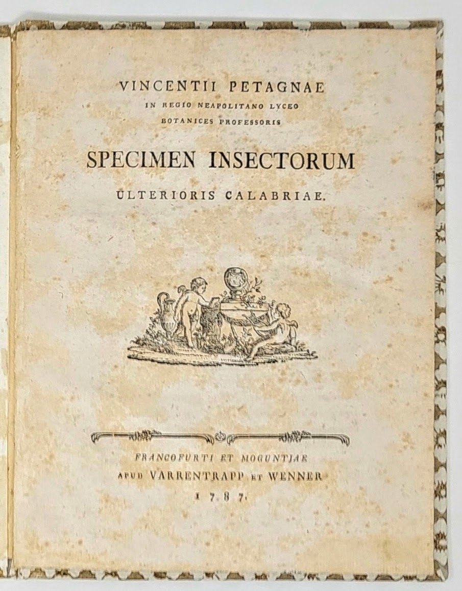 >in-4, pp. Vi, 46, 1 tavola in fine raffigurante 38 specie di insetti (tra cui coleotteri, lepidotteri, imenotteri), frontespizio con vignetta xilogr., testatine e finalini; legatura in bel cartonato posteriore con decori floreali, tagli spruzzati d'azzurro. Seconda edizione (la prima a Napoli l'anno precedente) di una delle prime opere di entomologia riguardanti l'Italia meridionale. Rarissima opera (presente in due sole biblioteche italiane) che riporta 240 esemplari di insetti riscontrati (e tavolta scoperti) in Calabria dal Petagna, che fu insigne medico, biologo ed entomologo. Buon esemplare, sporadiche fioriture della carta. Horn-Schenkling 17088.