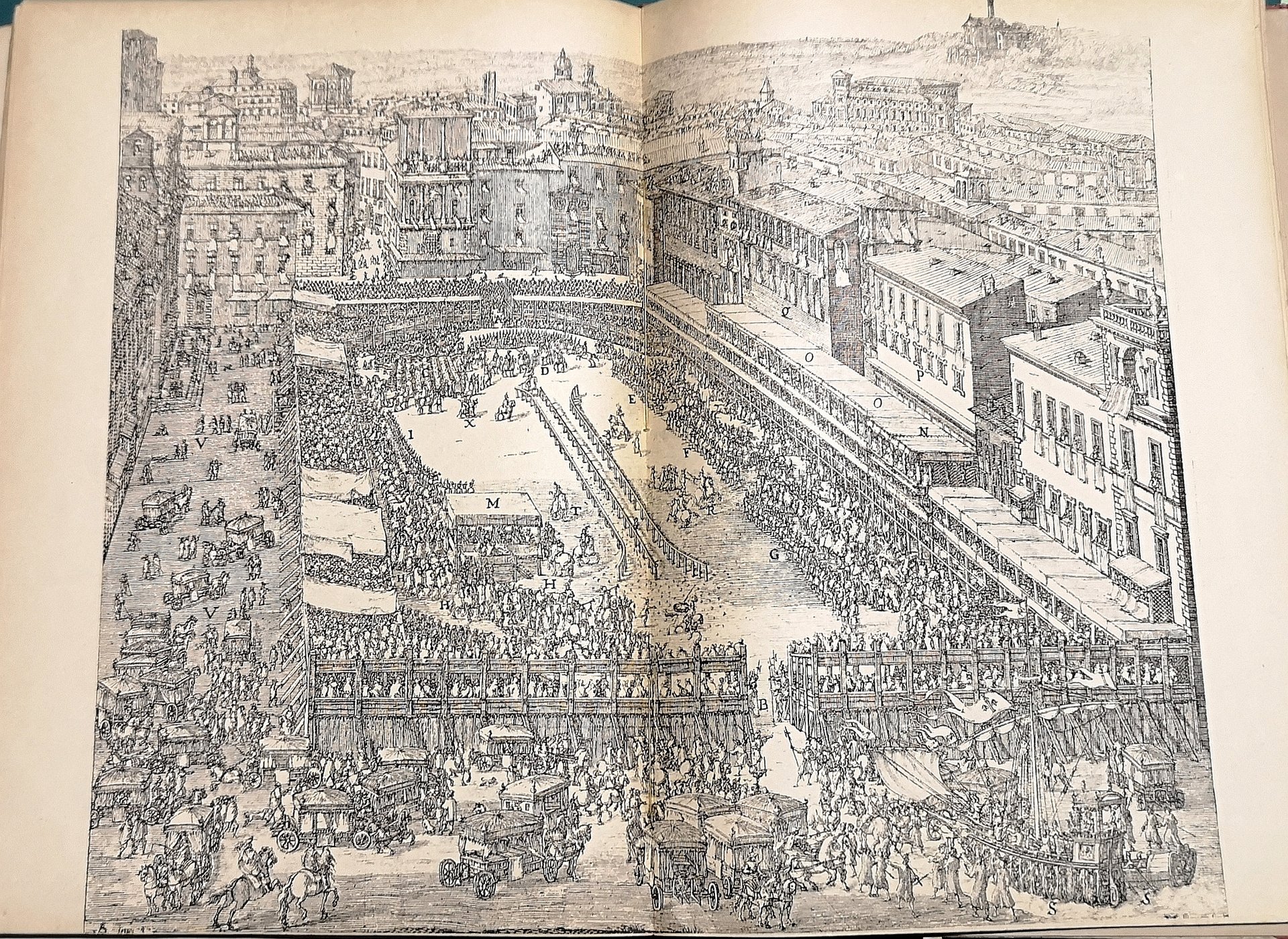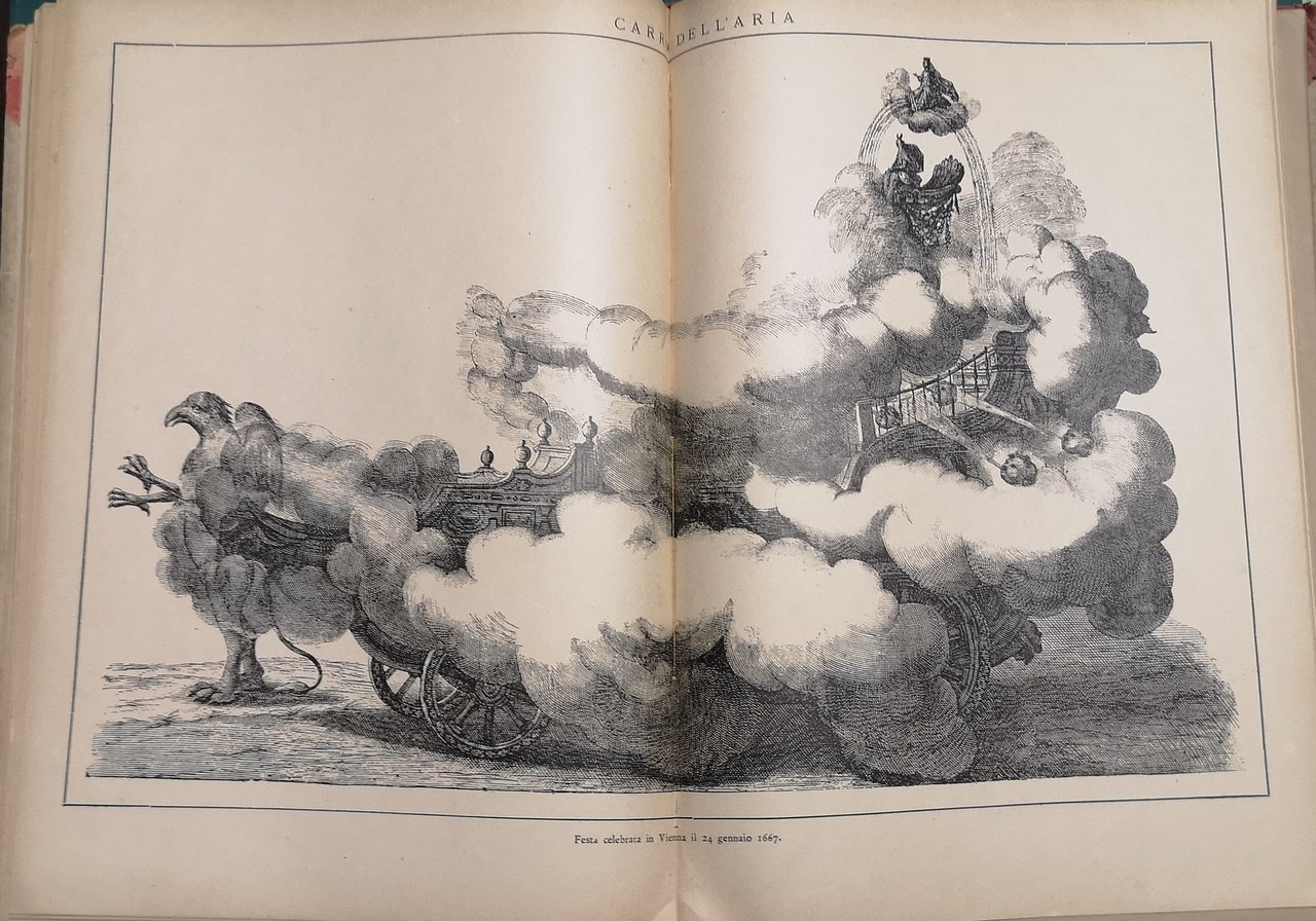 >in-4, pp. XI, 169, (2), illustrate da 21 grandi tavole (anche a doppia pagina) e decine di figure n.t.; legatura editoriale in m. tela e angoli, piatti in cart. figurato (purtroppo consunta). Opera assai documentata e con magnifico apparato di immagini che descrive tre grandi feste del diacessettesimo secolo: Amore e Gloria, in Milano - La Corsa del Saracino, in Roma - La Contesa dell'Aria e dell'Acqua, in Vienna. Discreto esemplare, a pieni margini (uniforme brunitura della carta).