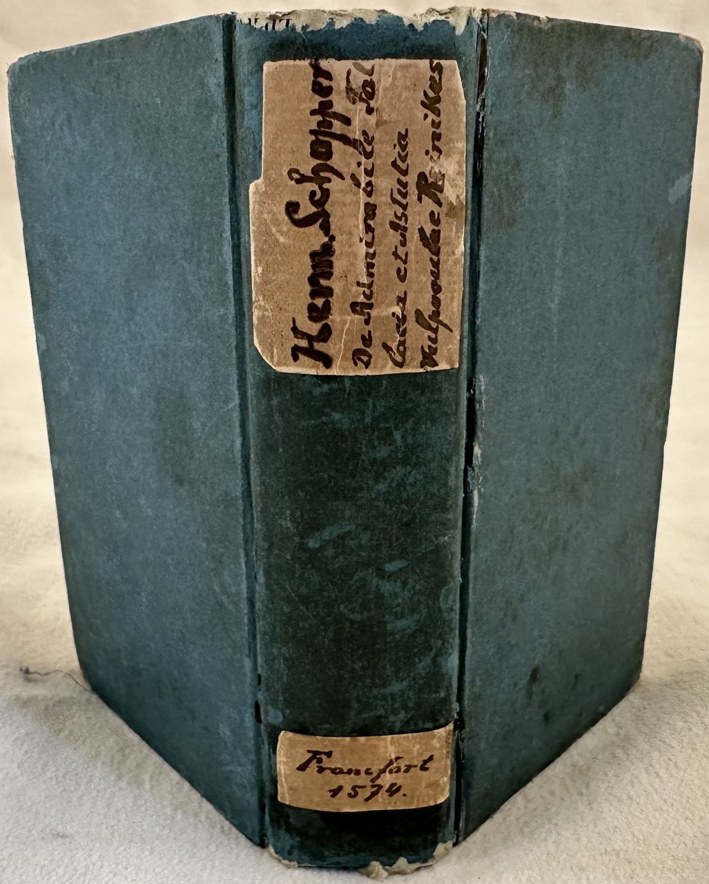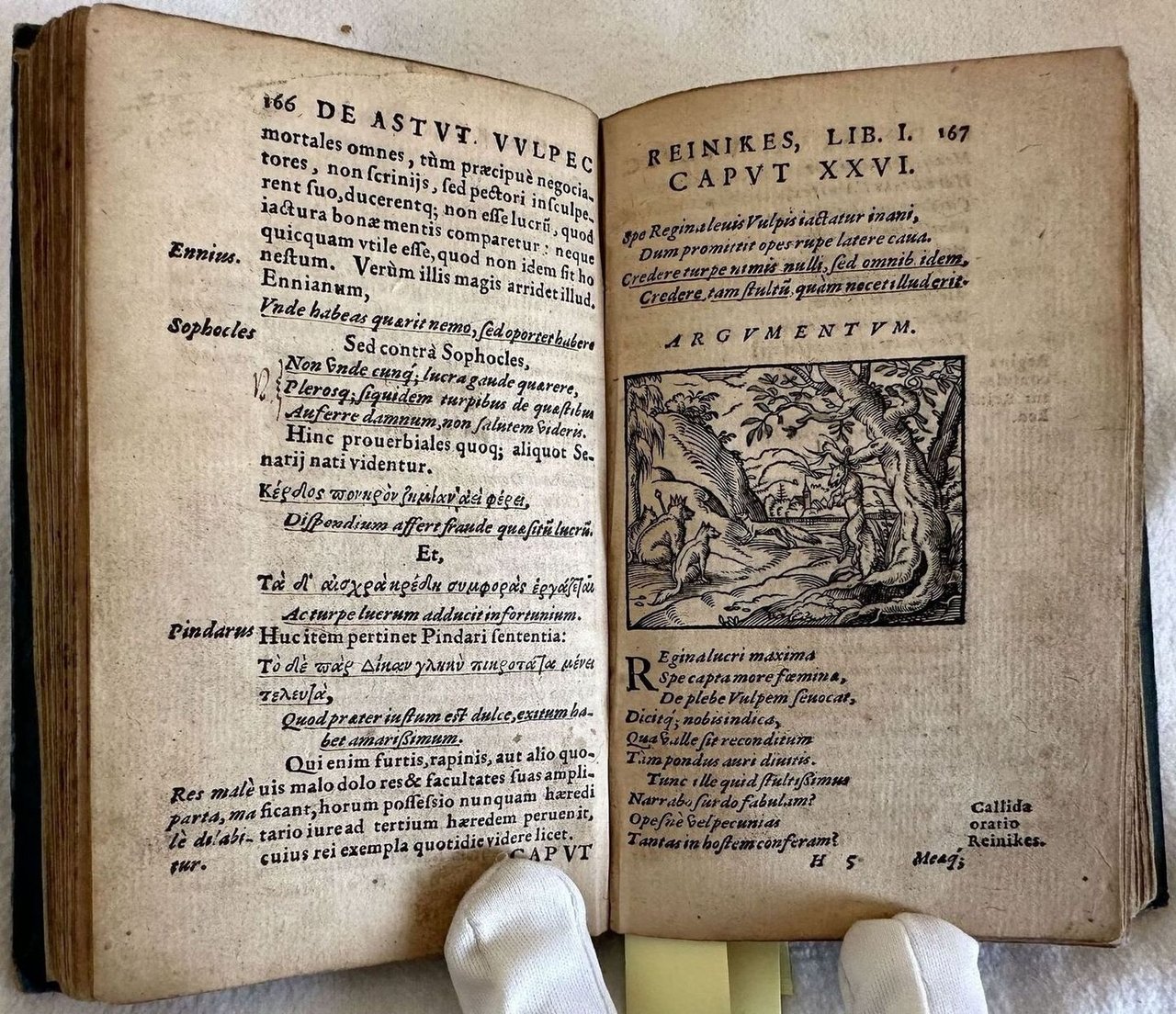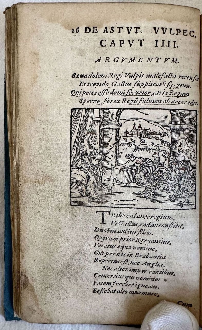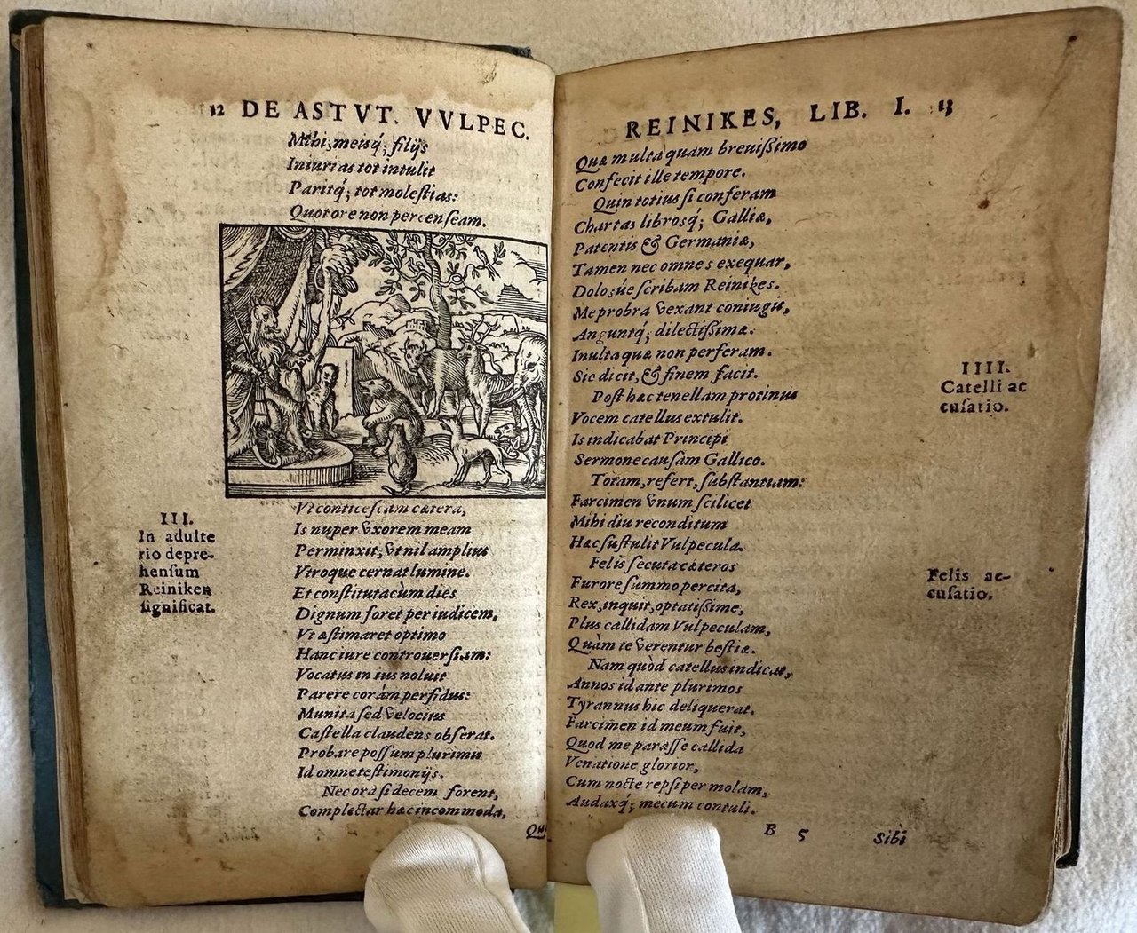 Bella edizione illustrata del 1574 della celebre opera satirica a cura dell'umanista e soldato Hatmann Schopper (1542-1595). Traduzione in lingua latina a cura di Reineke Fuchs. Il ciclo di racconti "Le Roman de Renart" è una raccolta di fiabe medievali del XII e XIII secolo nel quale gli animali agiscono al posto degli esseri umani. Principali protagonisti sono Renart la volpe affiancato dal lupo Ysengrin e dal re-leone. Il testo è impreziosito da 52 finissime xilografie a mezza pagina incise da Jost Amman (1539-1562) alcune delle quali basate sulle famose illustrazioni create da Virgil Solis (1514-1562) già presenti nella prima traduzione latina del 1567. Le xilografie alle pagine 1, 33, 56, 96, 108 (ripetute nella 332 e 338), 465, 476 e 485 di Jost Amman riportano monogramma "IA" o solo "A" Marca editoriale al frontespizio e all'ultima carta che riporta la data 1575. Antiche note manoscritte. In buone condizioni. Copertina cartonata con titolo manoscritto su etichetta al dorso in buone condizioni generali con lievi usure ai margini e dorso. Legatura in buone condizioni. All'interno le pagine si presentano in buone condizioni con fioriture. Strappo laterale di cm 5,5 all'ultima carta Y6. In 24. Dim. 14x8,5 cm. Pp. (20)+506+(20). Beautiful illustrated edition of 1574 of the famous satyrical work by the humanist and soldier Hatmann Schopper (1542-1595). Translation in latin language by Reineke Fuchs. The cycle of tales "Le Roman de Renart" is a collection of medieval tales of 12th and 13th century in which the animals interact n the place of human beings. The main carachters are Renart the fox with the wolf Ysengrin and the King Lion. The text is enriched by 52 very fine half-page woodcuts engraved by Jost Amman (1539-1562) some of them are based on the famous illustrations created by Virgil Solis (1514-1562) that already appeared in the first latin translation of 1567. The woodcuts in pages 1, 33, 56, 96, 108 (reapeted in 332 and 338), 465, 476 and 485 by Jost Amman have the monogram "IA" or only "A" Editorial mark in the title page and in the last page with date 1575. Antique handwritten notes. In good conditions. Carton editorial cover with handwritten title on label in the spine in good general conditions lightly worn in the extremities. Binding in good conditions. Inside pages are in good conditions with foxing. Lateral tear of cm 5,5 in the last page Y6. In 24. Dim. 14x8,5 cm. Pp. (20)+506+(20).