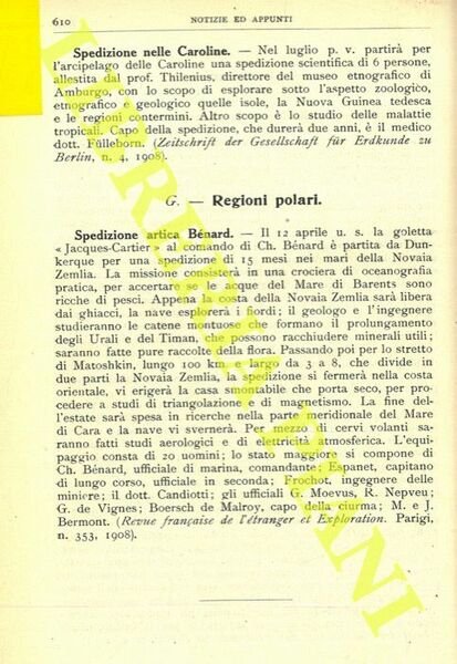 Roma, Società Geografica Italiana, 1908, 8vo stralcio con copertina posticcia muta, la sola pag. 610 (stralcio di una pagina) . - ! ATTENZIONE !: Con il termine estratto (o stralcio) intendiamo riferirci ad un fascicolo contenente un articolo, completo in se, sia che esso sia stato stampato a parte utilizzando la stessa composizione sia che provenga direttamente da una rivista. Le pagine sono indicate come "da/a", ad esempio: 229/231 significa che il testo è composto da tre pagine. Quando la rivista di provenienza non viene indicata é perché ci è sconosciuta. - ! ATTENTION !: : NOT A BOOK : “extract” or “excerpt” means simply a few pages, original nonetheless, printed in a magazine. Pages are indicated as in "from” “to", for example: 229/231 means the text comprises three pages (229, 230 and 231). If the magazine that contained the pages is not mentioned, it is because it is unknown to us.