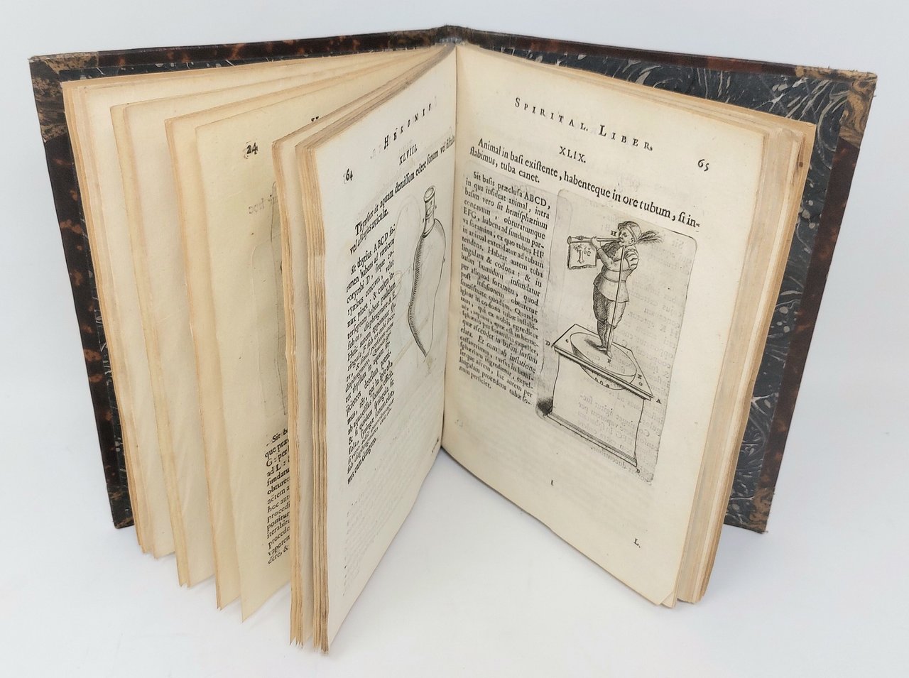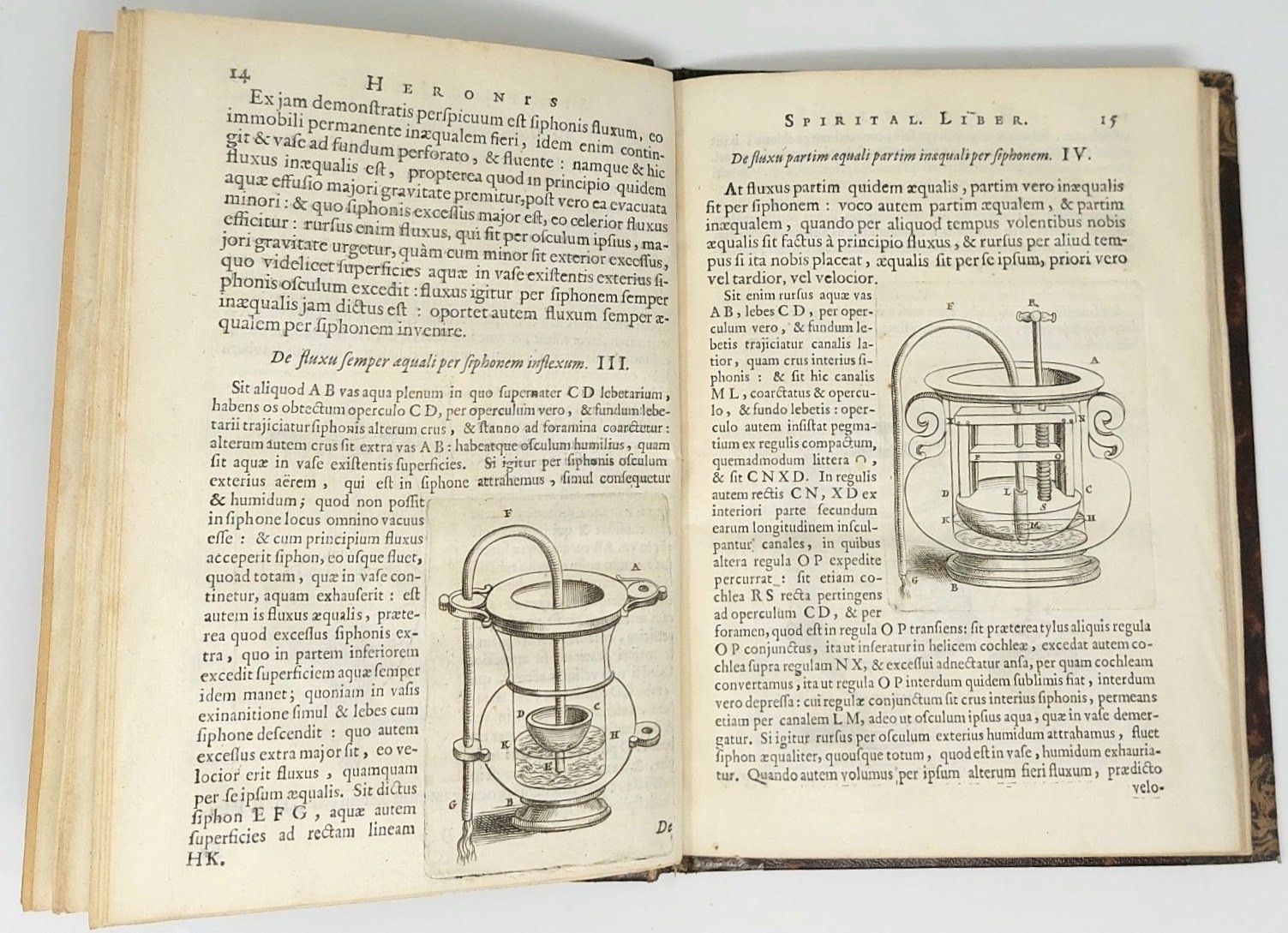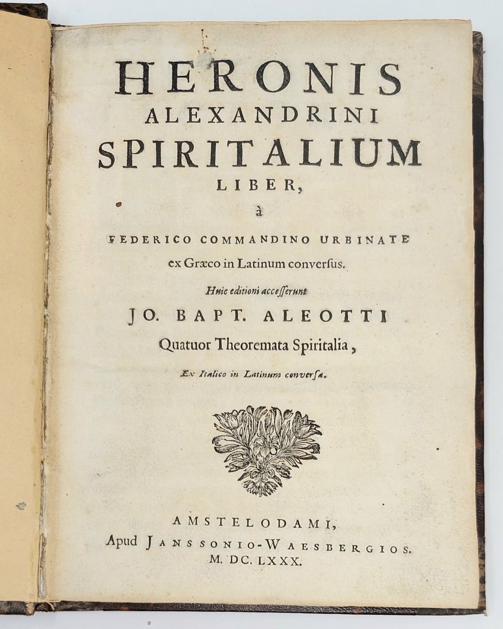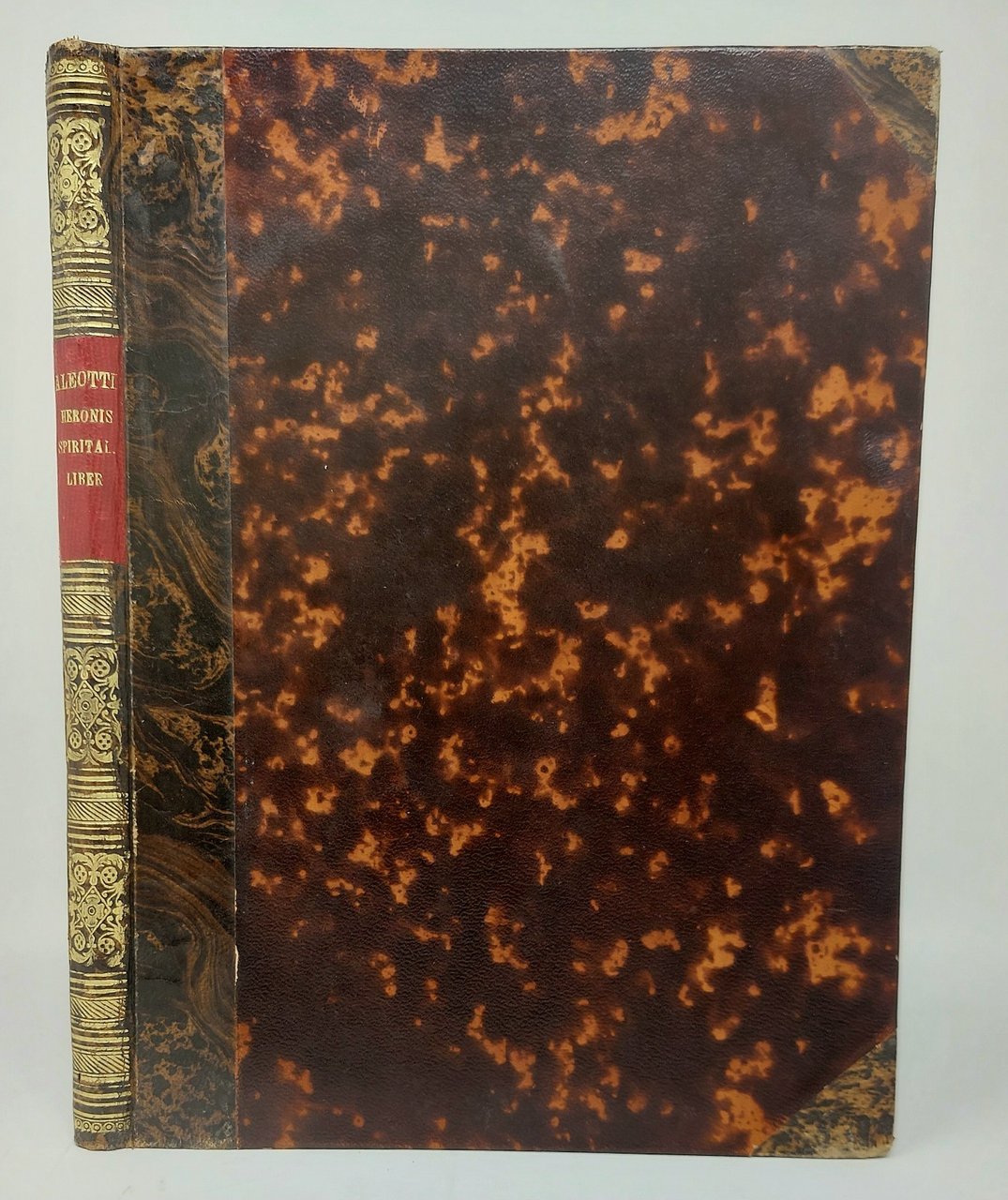 >in-4, pp. (4), 99, (1 b.), mancante delle Aggiunte dell'Aleotti (pp. 101-120); legatura moderna in pelle marmorizzata, tit. oro su tassello rosso e fregi al dorso. Corredato da varie decine di figure tecniche assai bene incise in rame, ad illustrare i teoremi idraulici e le loro applicazioni. Prima edizione in lingua latina di quest'opera dell'ingegnere e matematico greco apparsa per la prima volta in latino nel 1575. Erone (II o III sec. d.C.) fu uno dei massimi esponenti della scuola meccanica d'Alessandria e a lui si devono, oltre a nozioni teoriche, interessanti applicazioni pratiche destinate a suscitare meraviglia legate ai sifoni, sui quali basò la costruzione dei giochi d'acqua. Buon esemplare, ma antico restauro al margine esterno di p. 32 e mancanti le aggiunte dell'Aleotti. Brunet III, 129. Graesse III, 258.Poggendorf I, 1084.