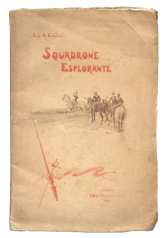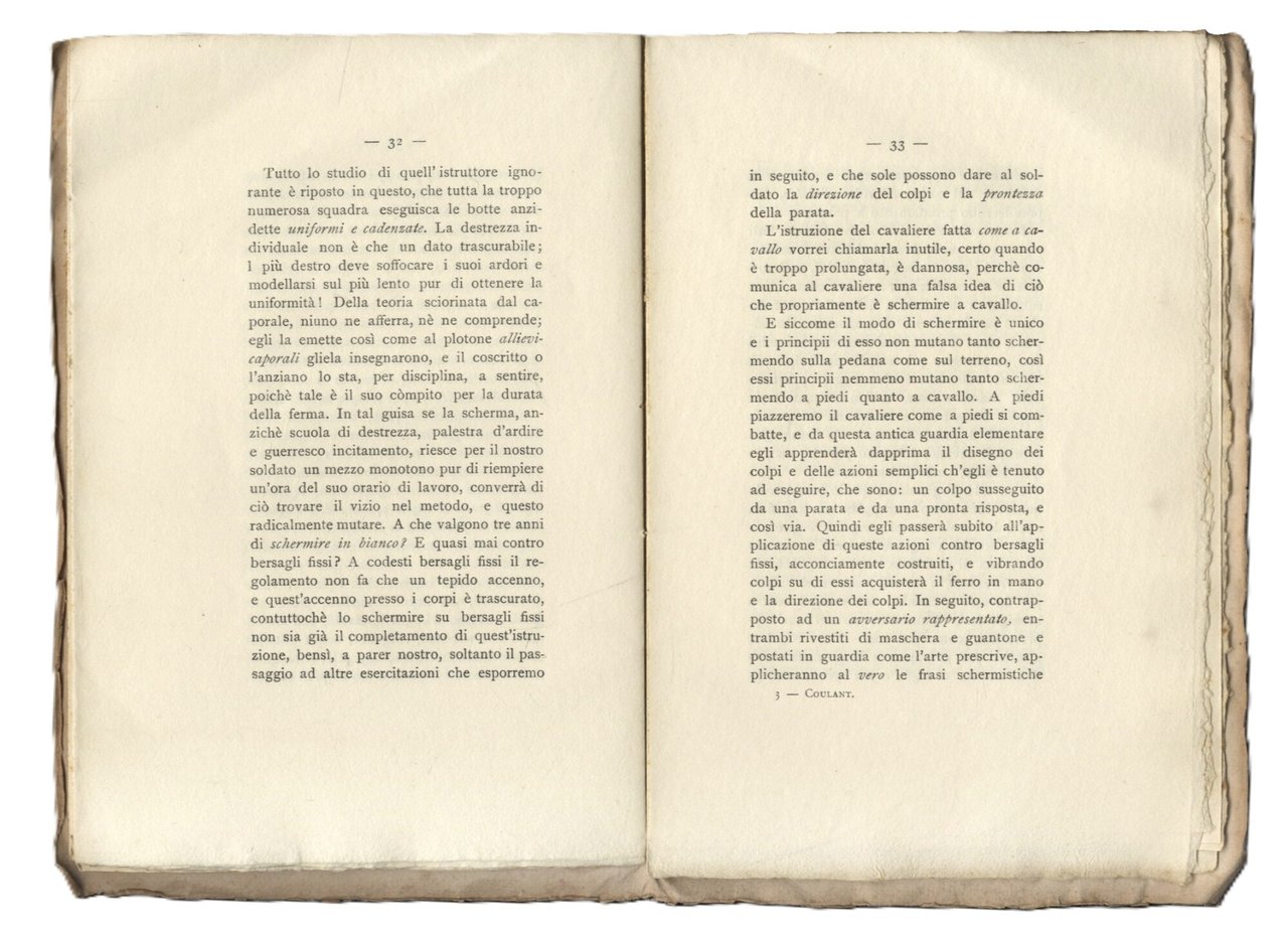 >in-8 (190x130 mm), pp. 42, (2 bianche). Brossura editoriale figurata in rosso e bistro. Prima ed unica edizione, rarissima, di questo trattato di scherma a cavallo tardo ottocentesca, compilato dal Capitano Coulant, che in seguito sarebbe stato Generale. Vi sono approfondite sia le funzioni tattiche della cavalleria negli scenari militari moderni, sia le tecniche di scherma a cavallo. Stupendo esemplare, ben impresso su carta forte, in barbe, perfettamente preservato e con dedica autografa dell'autore all'occhietto.