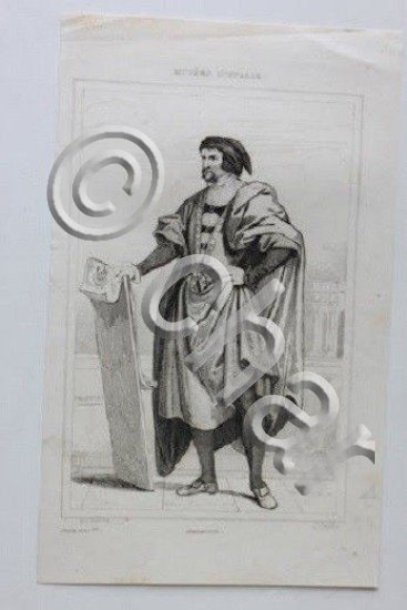 *** Stampa incisione d'epoca databile nell'800 - Storia dell'arte quattrocento - Ritratto : pittore Masaccio. Masaccio, soprannome di Tommaso di ser Giovanni di Mone Cassai (Castel San Giovanni, 21 dicembre 1401 – Roma, estate 1428), è stato un pittore italiano. Fu uno degli iniziatori del Rinascimento a Firenze, rinnovando la pittura secondo una nuova visione rigorosa, che rifiutava gli eccessi decorativi e l'artificiosità dello stile allora dominante, il gotico internazionale. Partendo dalla sintesi volumetrica di Giotto, riletta attraverso la costruzione prospettica brunelleschiana e la forza plastica della statuaria donatelliana, inserì le sue «figure vivissime e con bella prontezza a la similitudine del vero» (Vasari) in architetture e paesaggi credibili, modellandole attraverso l'uso del chiaroscuro. Bernard Berenson disse di lui «Giotto rinato, che ripiglia il lavoro al punto dove la morte lo fermò». Dimensioni stampa mm. 250 x 145. Per appassionati, studiosi e collezionisti