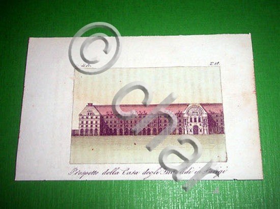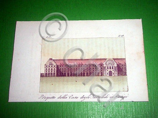 *** Stampa / incisione d' epoca acquerellata - Prospetto della Casa degli Invalidi in Parigi - tavola estratta dal volume, databile 1800 ca. Dimensioni stampa cm. 5,9 x 8,9 circa / Dimensioni dell' intero foglio cm. 9 x 13,9 circa Per appassionati, studiosi e collezionisti