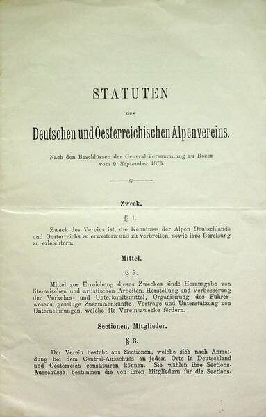 Statuten des Deutschen und Oesterreichischen Alpenvereins. Nach den Beschlüssen der General Versammlung zu Bozen vom 9. September 1876. | Rare and modern books | [Club Alpino Austro - Tedesco - Bolzano - Statuti].