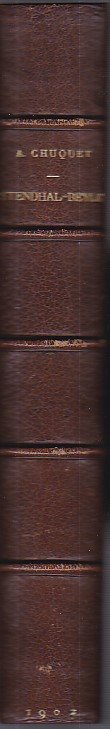 In-8°, pp. (16), 548, (10), bella legatura di inizio '900 firmata da H. Wood in m. marocchino marrone e angoli con titolo dorato su dorso a 5 nervi. Piatti marmorizzati, taglio di testa dorato. Fioriture alle prime e alle ultime cc., qualche minima ingiallitura marginale. Ottimo esemplare. Qualche leggera annotazione a matita. Prima edizione di questa dettagliata biografia di Stendhal. Alle pp. 478 e sgg., appendice di documenti e lettere inedite. Arthur Chuquet (Rocroi, 1853-Parigi, 1925) fu autore di numerose opere storiche e biografie, di cui la più nota è la Jeunesse de Napoléon (1897 -1899). Divenne membro dell'Institut de France nel 1900.
