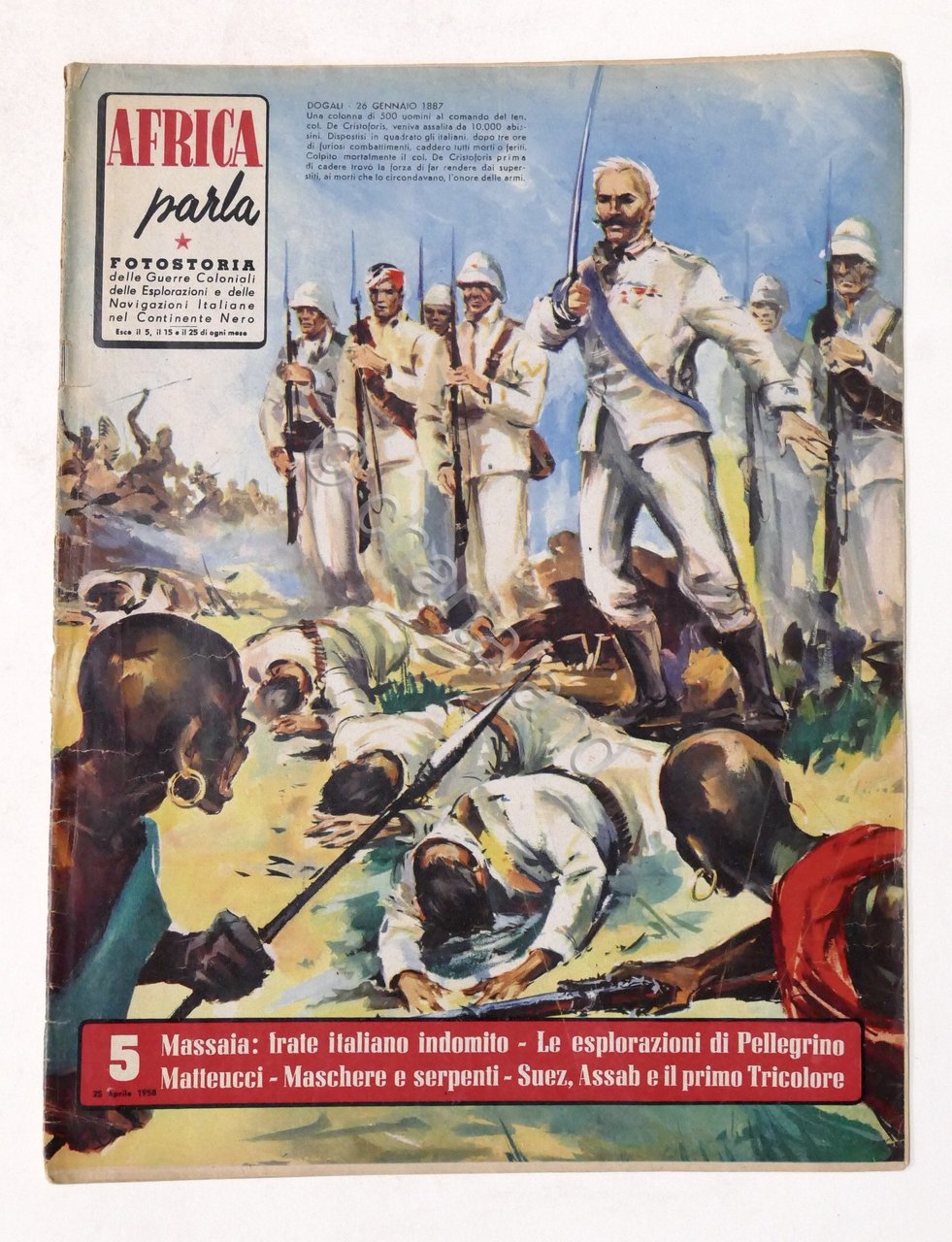 Storia Colonialismo Rivista - Africa parla - Fotostoria delle guerre coloniali, delle esplorazioni e delle navigazioni italiane nel Continente Nero - N° 5 - 25 aprile 1958 - pag. 22, con numerose illustrazioni. Testo in italiano. Copertina morbida. Buone condizioni, con piccoli segni del tempo.