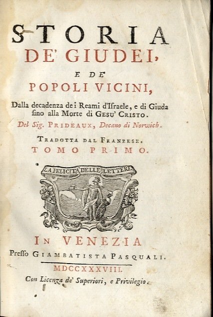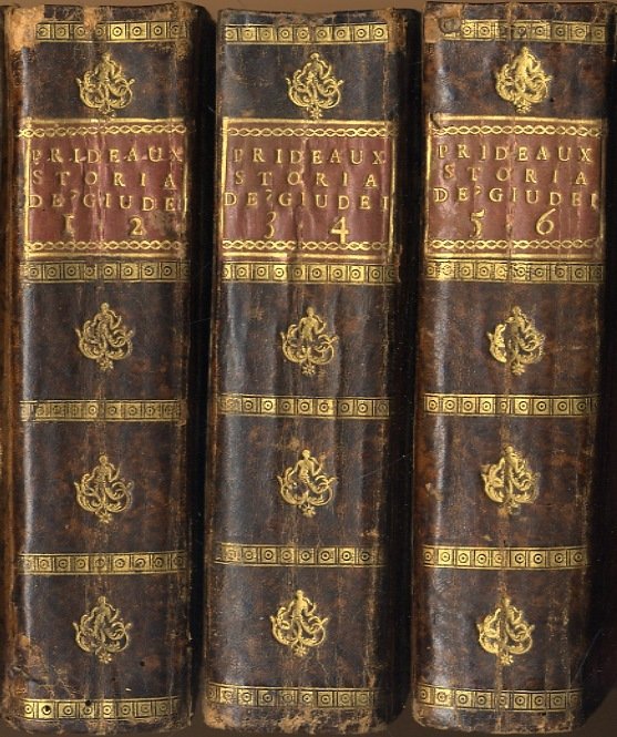 Prima traduzione italiana di quest'esaustiva opera storica, composta originariamente in inglese da H. Prideax, tradotta in varie lingue e ristampata anche a metà Ottocento. Esemplare in buono stato ma con piccoli difetti: lavoro di tarlo che intacca in particolare i primi 20 fogli del primo volume inclusa una tavola ripiegata, qualche piccola macchietta marrone e due tavole con maldestri antichi restauri al verso. Brunet IV, 872 (traduz. francese del 1728). Graesse V, 442 (altre ed. in varie lingue).