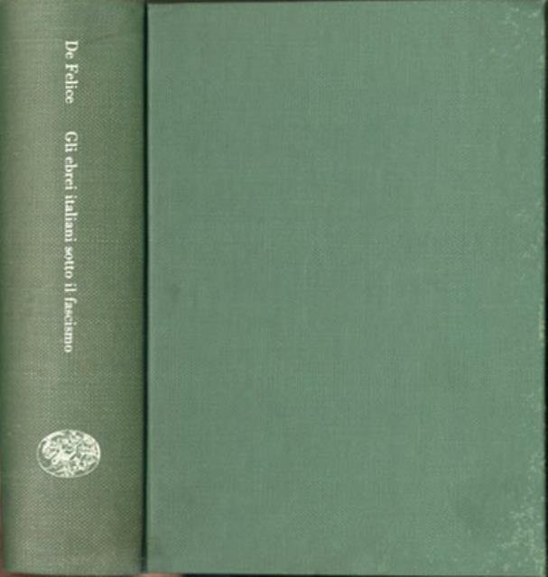 2. ed. XXXVI, 628 p., [16] p. di tav. : ill. ; 22 x 15 cm. Biblioteca di cultura storica, 68. La persecuzione antisemita scatenata nel 1938 da Mussolini è stata una delle tappe piú significative della storia del fascismo: con essa il regime divorziò pubblicamente dal popolo italiano, dalla sua mentalità e dalla sua storia. Renzo De Felice si è proposto di indagare con questo volume l'intima natura dei rapporti tra ebraismo e fascismo vagliando con scrupolo scientifico documenti d'archivio, testimonianze, lettere e carteggi. Prefazione di Delio Cantimori. Legatura editoriale, coperta teleta di colore verde in cartone rigido. Titolo impresso in bianco al dorso, muto il piatto, manca la sovraccoperta editoriale. La coperta mostra normali segni del tempo, le pagine interne e le illustrazioni in b/n su carta patinata fuori testo sono integre. Codice libreria 1135.