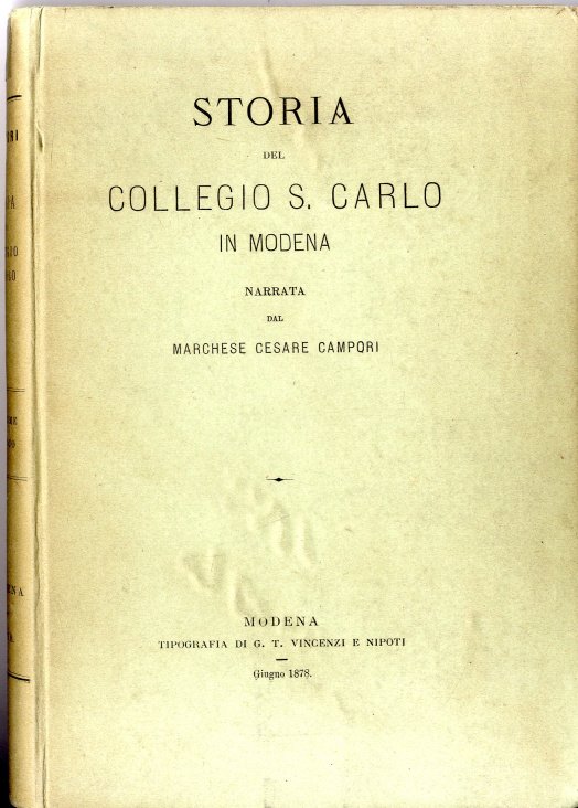 >In-8 pp. 238, legatura in cartone editoriale a stampa. Opera non comune che documenta la storia del Collegio San Carlo di Modena, dalla sua fondazione fino alla data di pubblicazione. Ottimo esemplare.