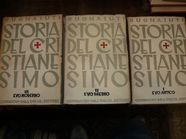 3 voll. in-8°, pp. 553; 738; 807, brossure editoriali. Don Ernesto Buonaiuti (Roma, 25 giugno 1881 – Roma, 20 aprile 1946) è stato un presbitero, storico, antifascista, teologo, accademico italiano, studioso di storia del cristianesimo e di filosofia religiosa, fra i principali esponenti del modernismo italiano. Scomunicato e dimesso dallo stato clericale dalla Chiesa cattolica per aver preso le difese del movimento modernista, fu prima esonerato dalle attività didattiche, in base ai Patti Lateranensi tra Chiesa e Regno d'Italia, e poi privato della cattedra universitaria per essersi rifiutato, con altri 11 docenti soltanto, di giurare fedeltà al regime.