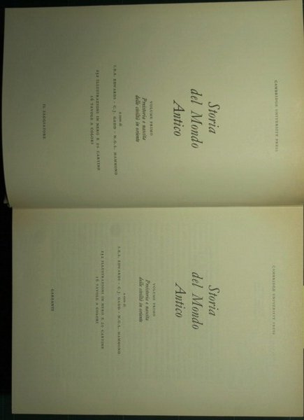 Cambridge University Press - Collana Collezione Maggiore Garzanti - in 8° - pp.1000 pp. ca. a volume - Tela con sovracopertina illustrata - Nove volumi - Illustrazioni a colori fuori testo e in b/n nel testo e fuori testo - Qualche strappetto senza mancanze alle sovracopertine, rare sottolineature a matita in poche pp. - Vol. I: Preistoria e nascita delle civiltà in Oriente; Vol. II: L'apogeo delle civiltà orientali: Egitto, Mesopotamia, Anatolia, Egeo; Vol. III: La crisi e la restaurazione dei regni orientali. Nascita della civiltà greca; Vol. IV: Persia e Grecia. L'impero ateniese; Vol. V: La fine della polis e l'ellenismo. Le origini di Roma; Vol. VI: L'espansione romana nel Mediterraneo; Vol. VII: La crisi della Repubblica romana; Vol. VIII: L'impero romano da Augusto agli Antonini; Vol. IX: Evoluzione e declino dell'impero romano