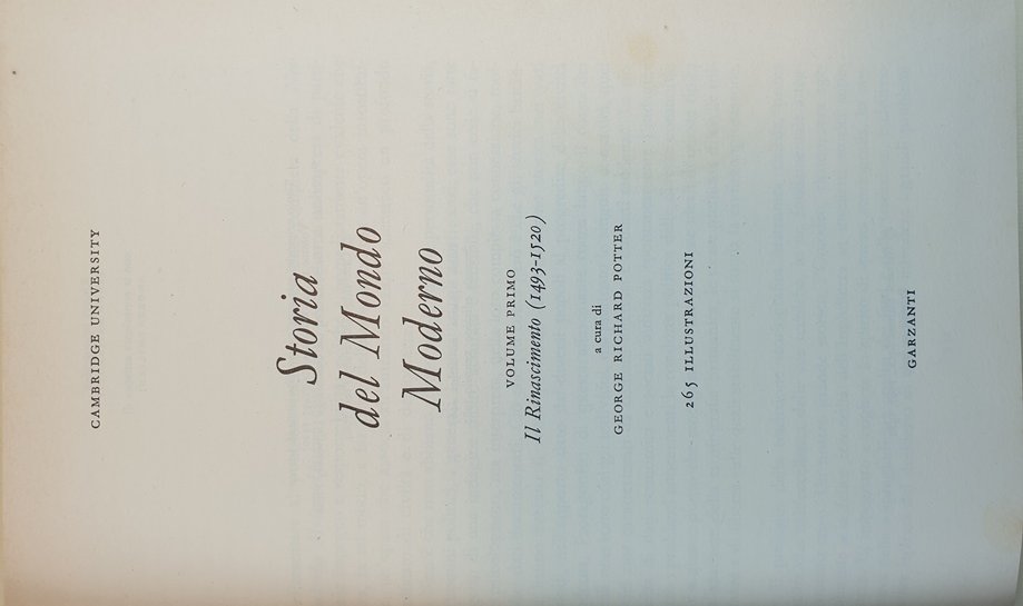 A cura di Cambridge University Press. Collezione Maggiore. - in 8° - pp.900 circa a volume - Tela con titolo in oro al dorso - 12 volumi - Numerose illustrazioni nel testo in bianco nero e tavole a colori fuori testo. - Stato di nuovo. - Non presenti le sovracopertine - L'Opera è così suddivisa: I: Il Rinascimento, II: La Riforma, III: La Controriforma e la rivoluzione dei prezzi, IV: La decadenza della Spagna e la Guerra dei Trent'anni, V: La supremazia della Francia, VI: L'ascesa della Gran Bretagna e della Russia, VII: Il vecchio regime, VIII: Le rivoluzioni d'America e di Francia, IX: Le guerre napoleoniche e la Restaurazione, X: Il culmine della potenza europea, XI: L'espansione coloniale e i problemi sociali, XII: I grandi conflitti mondiali.