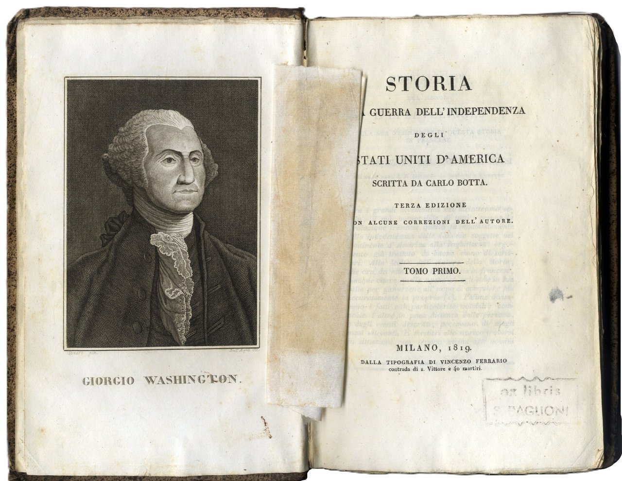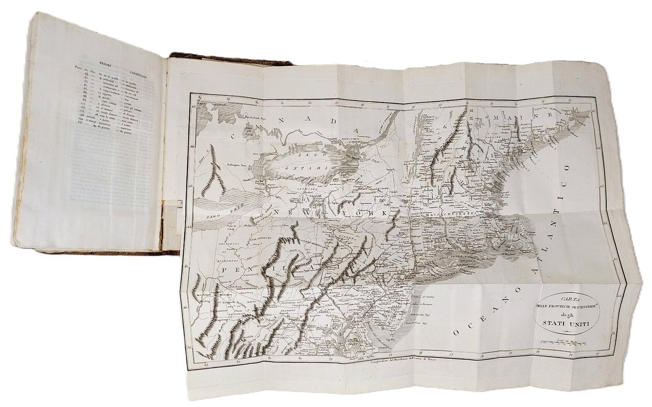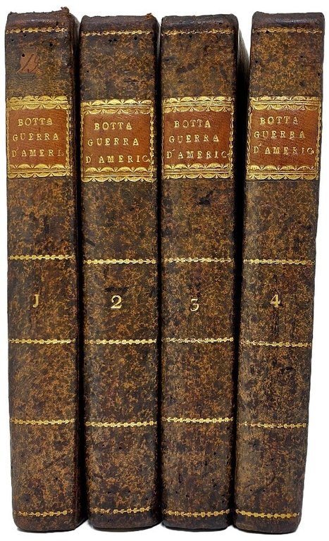 >4 volumi in-8 (220x140 mm), 1) pp. LXXIV, (2), 347, (1), con 3 tavole f.t.: ritratto di George Washington inciso da Dall'Acqua su dipinto di Stuart, 2 carte geografiche ripiegate che illustrano le province settentrionali e meridionali degli Stati Uniti; 2) pp. 510, (2), ritratto dell'A. inciso da C.A. Bovara; 3) pp. 522, (2), ritratto di B. Franklin inciso da C.A. Bovara; 4) pp. 478, (2), VIII, ritratto di La-Fayette inciso da Luigi Bridi. Legatura coeva in m. pelle marmorizzata, titoli e filetti in oro al dorso, piatti in carta marmorizzata. Terza edizione, completa di aggiunte e correzioni dell'autore, sulla prima edizione (Parigi, 1809). Opera storica prima del Botta, patriota e storico, ispirata dal suo amore per la libertà e dall'ammirazione di George Washington, il cui discorso tenuto al Congresso nel 1783 chiude non a caso la narrazione. I volumi comprendono non solo la guerra d'indipendenza, ma ripercorrono l'intera storia della società nord-americana. Ottimo esemplare, fresco e in barbe, timbro di biblioteca estinta (S. Baglioni) al titolo di ciascun volume. Parenti, Rarità Bibliografiche, IV, p. 208.