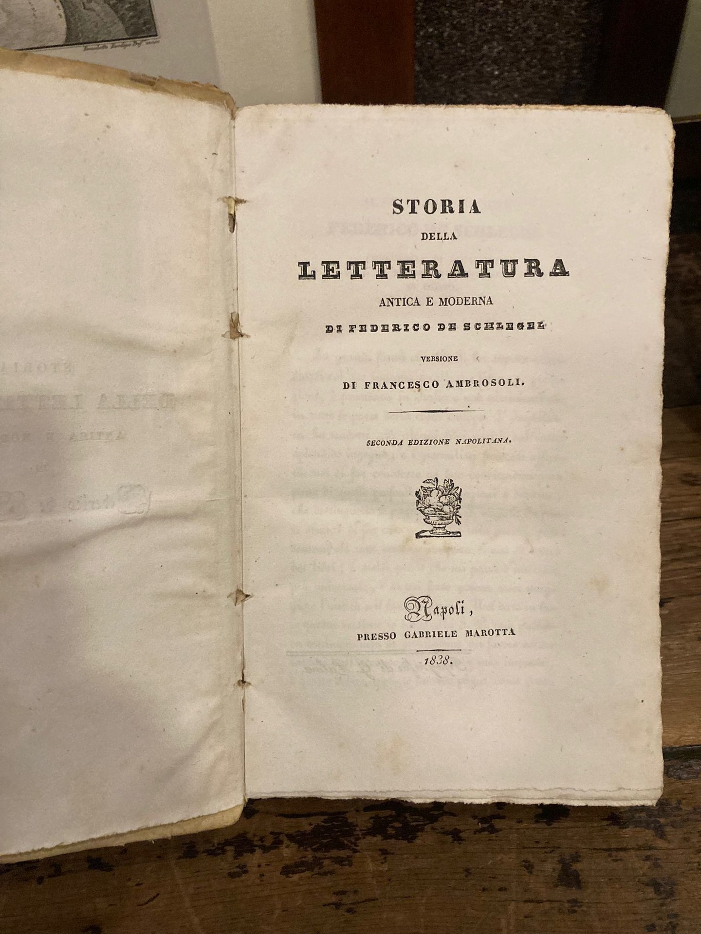 In-8° antico (19x12 cm), pp. 374 (2) bianche, cartonatura coeva con titolo calligrafato al dorso. Lievi difetti ai piatti e al dorso ma più che buon esemplare genuino in barbe. Non comune stampa napoletana della classica opera di critica letteraria e filosofica di Friedrich Schlegel fratello del filosofo e con lui fondatore di Athenaum, rivista in cui venne teorizzato il Romanticismo. Largo spazio viene destinato alla letteratura Norrena, all' epica cavalleresca e alla filosofia. Quest'opera ebbe vasta eco nei salotti culturali risorgimentali.