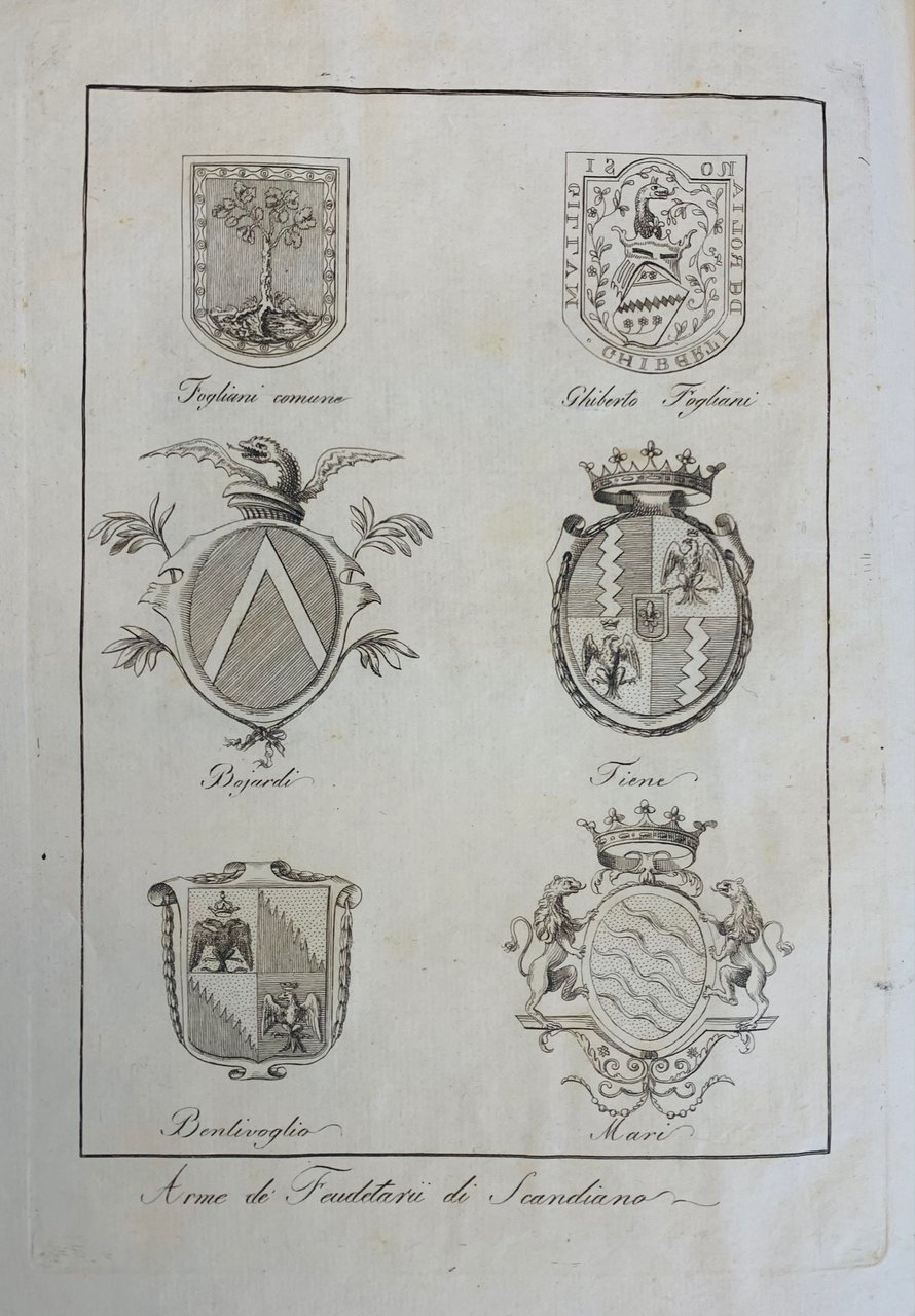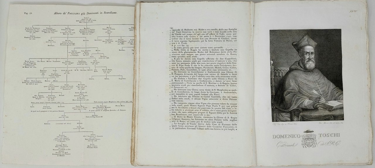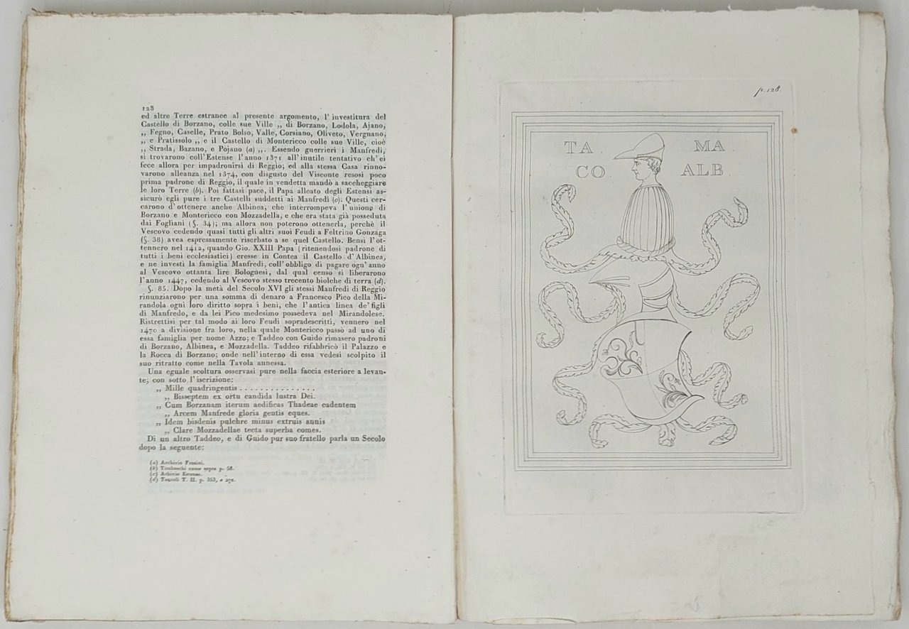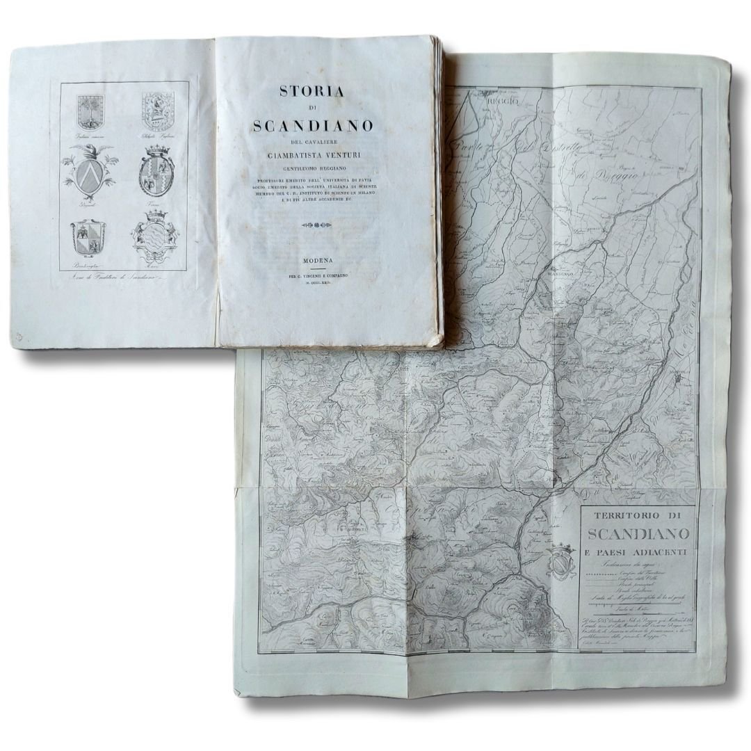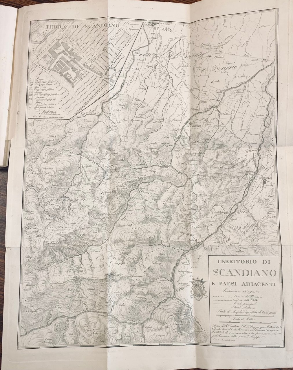 >in-4 (mm. 295x210) pp. (2),252,(2); legatura in cartonato muto coevo con tassello in carta al dorso. Illustrato da 18 tavole f.t così composte: "Arme dei feudatari di Scandiano", due grandi tabelle ripieg. con gli alberi genealogici della famiglia Fogliani e Bojardi, una tavola in sanguigna "Onici margacee dendritiche dello Scandianese", 9 ritratti, 1 dipinto del Correggio, 3 al tratto e una grande carta incisa in rame più volte ripiegata del "Territorio di Scandiano e paesi adiacenti". Sul risguardo anteriore è applicata un'etichetta originale dell'editore con i prezzi del volume, della carta geografica e della legatura, degli esemplari in carta real soprafina. Prima edizione di questa opera, molto dettagliata sui personaggi più illustri di Scandiano con le biografie di Matteo Maria Boiardo, Antonio Vallisneri, Lazzaro Spallanzani, e Bonaventura Corti. Opera di grande erudizione, in cui l'autore esamina le vicende di Scandiano e del suo territorio dal punto di vista storico, geografico, letterario, della storia naturale, dell'archeologia e dell'epigrafia, dell'agricoltura e dell'economia. Buon esemplare ben conservato qualche piccola marginale macchietta rossa. Lozzi, 4960.