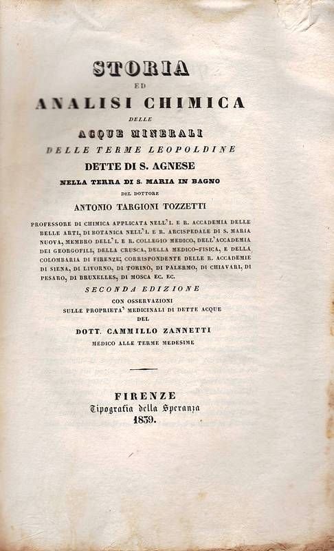 Storia ed analisi chimica delle acque minerali delle Terme Leopoldine dette di S. Agnese nella terra di S. Maria in Bagno. Seconda edizione con osservazioni sulle proprieta' medicinali di dette acque del dott. Camillo Zanetti. | Rare and modern books | Targioni Tozzetti Antonio.