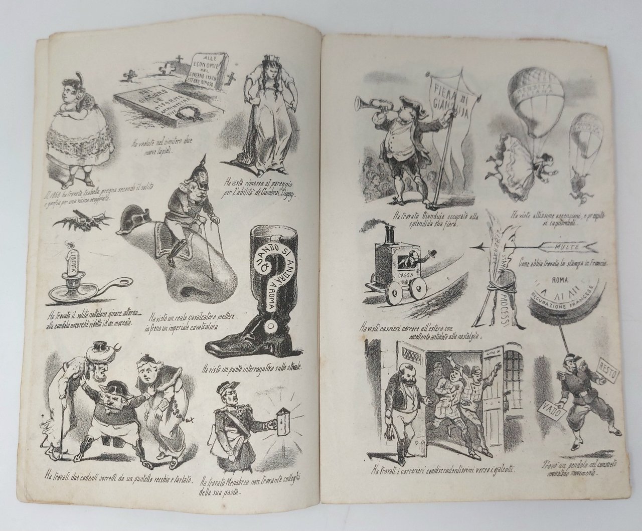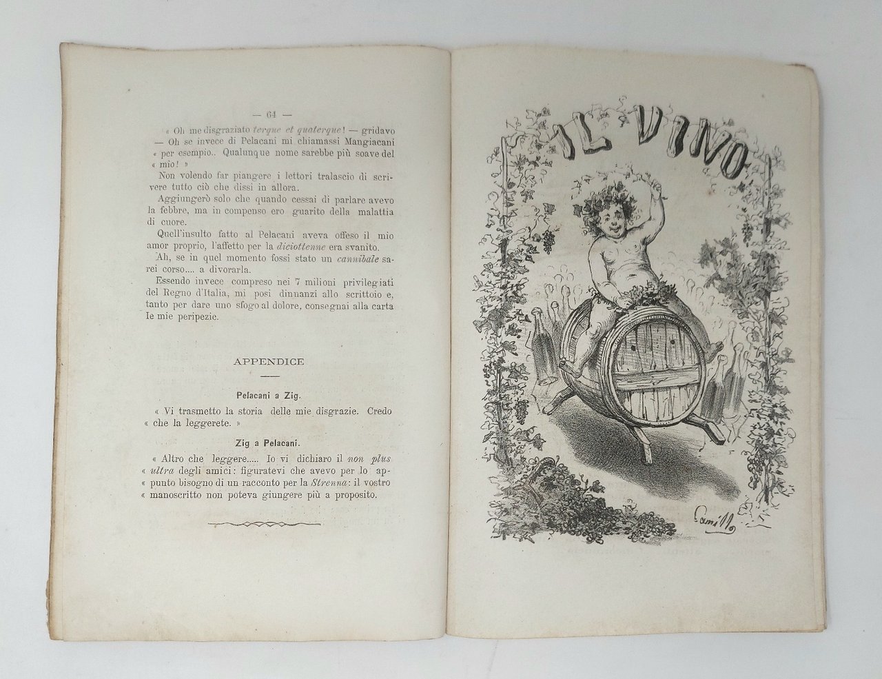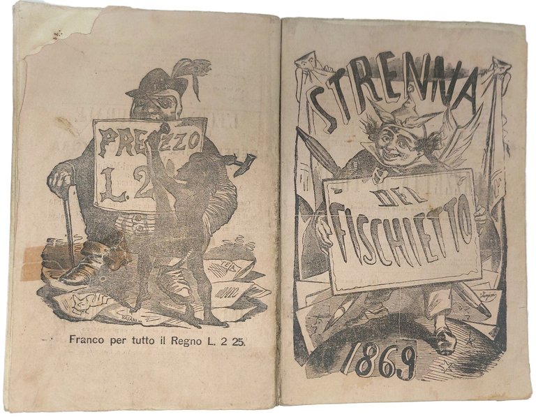 >in-8 (228x150mm), pp. 150, (2), brossura editoriale figurata (mancanza al dorso e ad un angolo della brossura posteriore, qualche lieve fioritura).Interessante annata di questa pubblicazione annuale fortemente satirica, in quanto tra i vari capitoli comprende: le ironiche “Memorie d'un avvocato” ed il divertente “Il Vino”, 8 pp. nelle quali si narra di come Noè fece a coltivare la vite e di quali furono gli effetti del vino sull'uomo. La “Strenna del Fischietto” rispecchiava il carattere liberale e cavouriano del giornale fondato a Torino dal caricaturista Icilio Pedrone che si proponeva di “fischiare su tutte le cose ingiuste”.