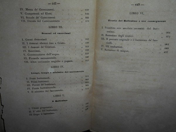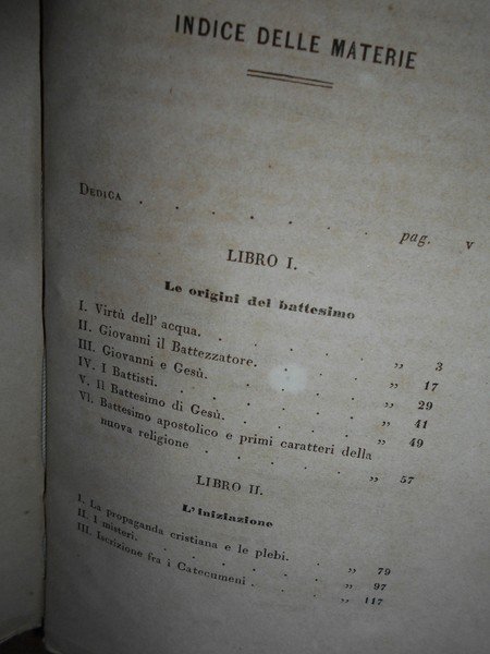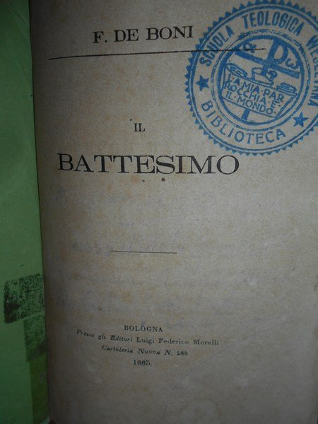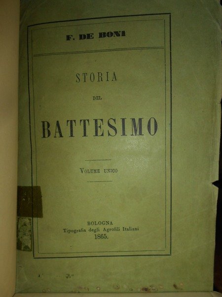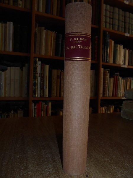 (Studi esoterici e religiosi) F. De Boni. Bologna, Tipografia degli Agrofili Italiani, (presso gli Editori Luigi Federico Morelli Cartoleria Nuova N. 588), 1865. Storia del Battesimo. In-16°, legatura nuova in m.tela con titolo in oro entro tassello al dorso, copertine originali conservate. (6), 443, (1) pp. Ben conservato con brossure originali conservate. Timbro coevo di Biblioteca estinta. Esemplare con barbe. Uff. TV. mob. nostro