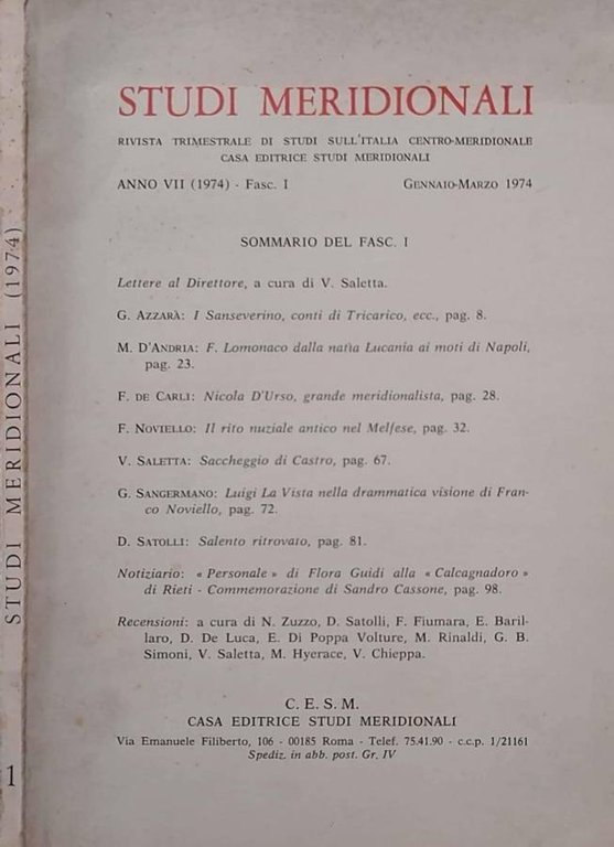 Studi meridionali. Rivista trimestrale di studi aull'Italia centro-meridionale. Anno VII. Fasc. 1, Gennaio-Marzo 1974