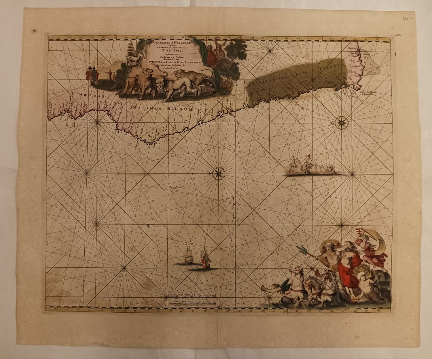 Bella e rara carta nautica, tratta dal celebre atlante di De Witt ''Orbis Maritimus ofte Zee Atlas“, della costa atlantica meridionale dell'Africa. Nel cartiglio titolo in latino e olandese: a sinistra un gruppo di europei che conducono negoziati commerciali. Al centro, tre leoni, un leopardo e un serpente dividono il cartiglio. Sulla destra due nativi. In basso a destra della carta nautica sono rappresentati Nettuno e una figura femminile, trainati su un carro da tre cavalli. La costa presenta molte insenature e l'isola di S. Elena Nuova è un po' più a sud del solito.