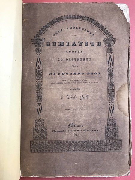 In-8°, pp. (6), 376, brossura editoriale con incollata al dorso un foglio di carta decorata del secolo successivo come sovracc. Bruniture diffuse. Prima edizione italiana dell’opera di Édouard-Constant Biot, ‘De l’abolition de l’esclavage ancien en Occident.’. Nel complesso un buon esemplare. Biblioteca Luigi Einaudi. Supplemento, A.72