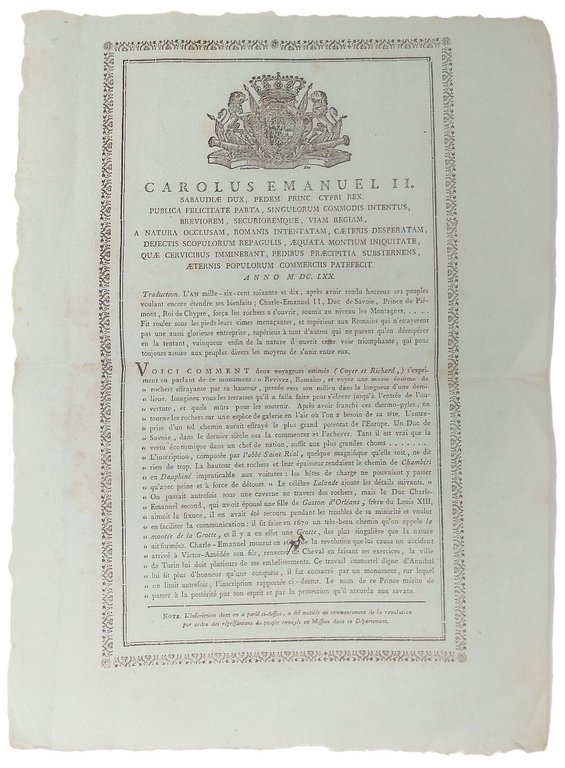 Sull'epigrafe posta sul monumento in onore di Carlo Emanuele II per la realizzazione della Voie Sarde.