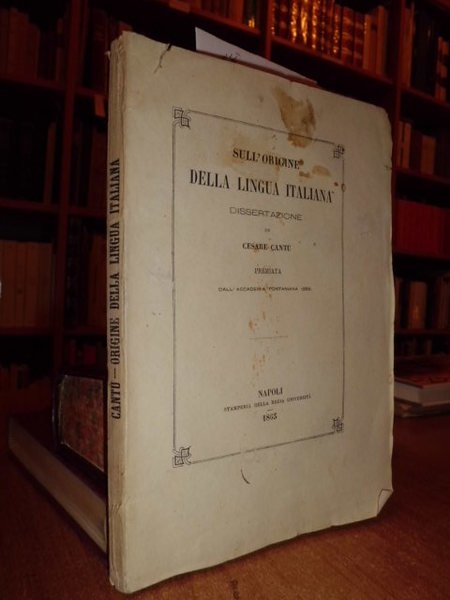 Cantù, Cesare. Napoli, Stamperia della Regia Università, 1865. Sull' origine della lingua italiana dissertazione premiata dall' Accademia Pontaniana. In - 8°, br., cop. orig. (una lieve macchia in alto). (8), 190 pp. Neg. mb. 5