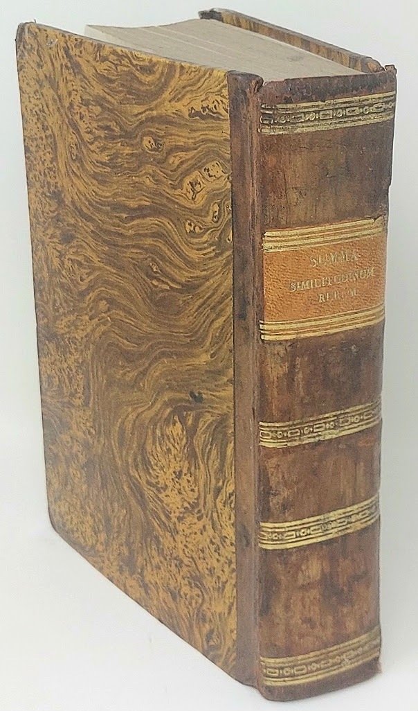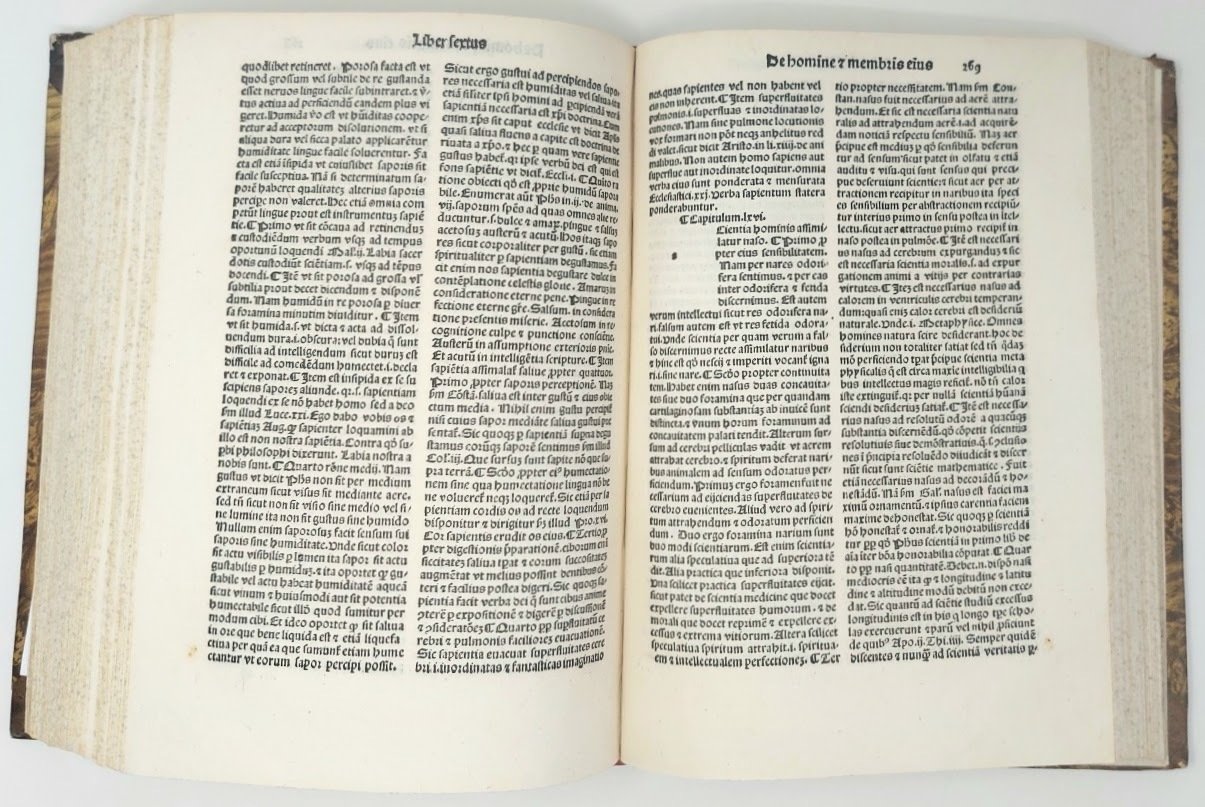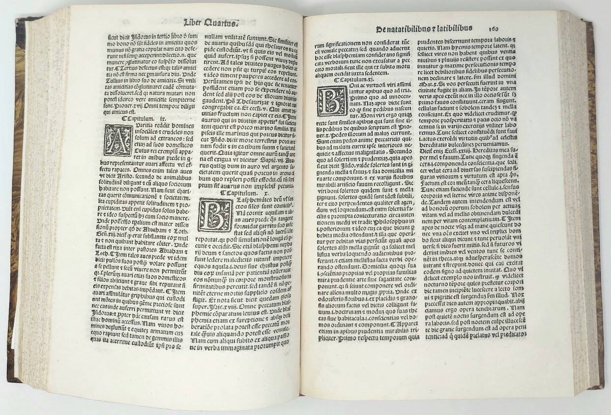 >in-4 (mm 178x127), ff. 396, di cui i primi 10 n.n. (vari errori nella numerazione: saltati i ff. 383 e 384, 386 segnato come 378), leg. ottocentesca in mezza pelle con tit. e filetti dorati sul dorso, tagli spruzzati. Impresso in carattere gotico su 2 colonne di ll. 48, con centinaia di iniziali silografiche istoriate, alcuni spazi bianchi con lettere guida, marca tipogr. a piena pag. in fine. Importante e non comune testo morale-scientifico di carattere enciclopedico redatto tra il 1298 e il 1314, con osservazioni su zoologia, mineralogia, anatomia, cibi e vini. La maggior parte degli "exempla" sono tratti dalla Bibbia, ma si fa riferimento anche a una serie di scrittori profani (Cicerone, Seneca, Plinio, Aristotele, Platone, Avicenna, Ippocrate, Galeno, Solino, Tolomeo) e forniscono associazioni mnemotecniche tra una serie di questioni morali e i diversi ambiti naturali che ne illustrano le caratteristiche. Edizione tratta dalla prima rarissima stampata in Italia nel 1497. Ottimo esemplare, fresco, impresso su carta forte. HC *7547. Klebs 562.5. BMC V, 351. Goff J-431. IGI 5357. ISTC N. ij00431000. Vaticana J-140. Manca al Bing.