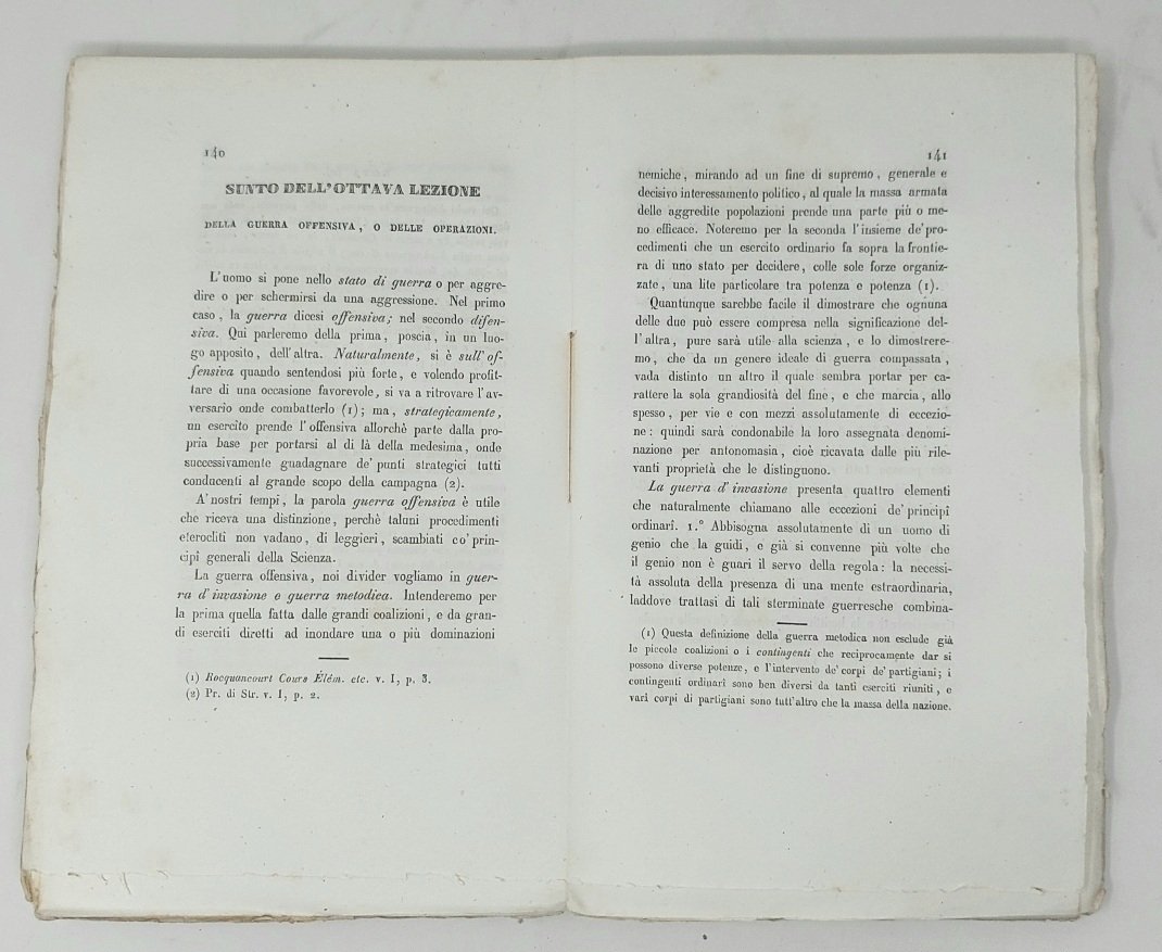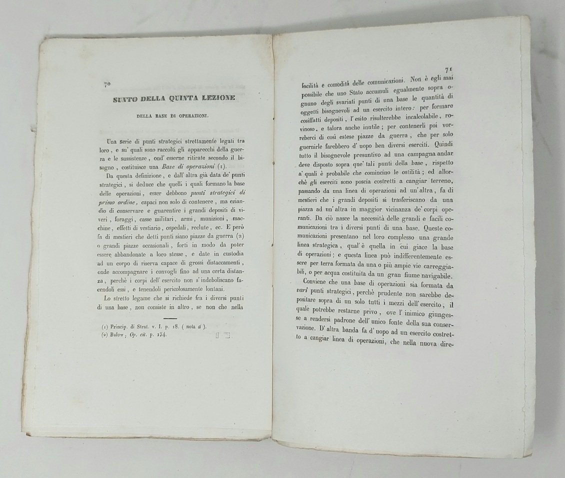 >in-8, pp. XXVIII, 284, bella brossura editoriale con restauri al dorso. Prima edizione di opera divisa in 12 lezioni di strategia militare: tra gli altri argomenti tratta delle linee strategiche, delle linee-frontiere, della guerra offensiva e degli accantonamenti. Il Sponzilli fu generale del neo costituito esercito italiano ed è noto per aver scritto un trattato storico-militare sulla battaglia di Canne (Del vero sito della battaglia di Canne ,1844). Ottimo esemplare a fogli chiusi.