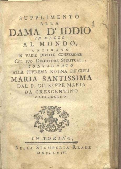 SUPPLIMENTO ALLA DAMA D'IDDIO IN MEZZO AL MONDO. Ordinato in varie divote conferenze col suo direttore spirituale, consagrato alla suprema regina dei Cieli Maria Santissima dal P. Giuseppe Maria da Crescentino, Cappuccino.