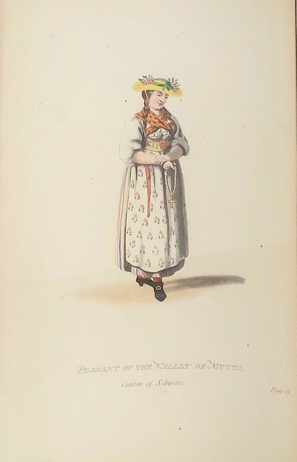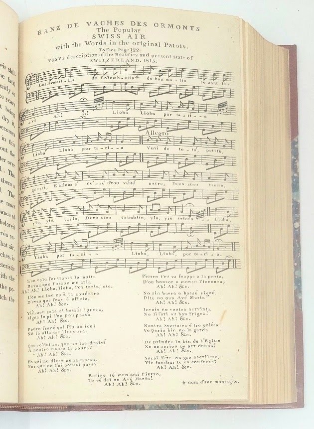 >2 vol. in 1 tomo in-8, pp. (4), VIII, 236; (4), 211, (1) con 50 tavole num. e colorate a mano e due tavole di musica. Leg. in m. marocchino rosso con angoli, titolo in oro su dorso a nervi. Prima edizione. Memorie di viaggio, dal 1802 al 1813 di Miss Ann Yosy, arricchite da 50 splendide tavole a colori che ritraggono costumi tradizionali svizzeri. Ottimo esemplare, assai fresco. Colas 3102; Brunet V, 1509; Lipperheide 906.