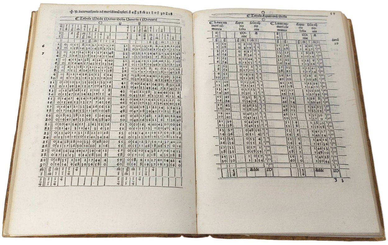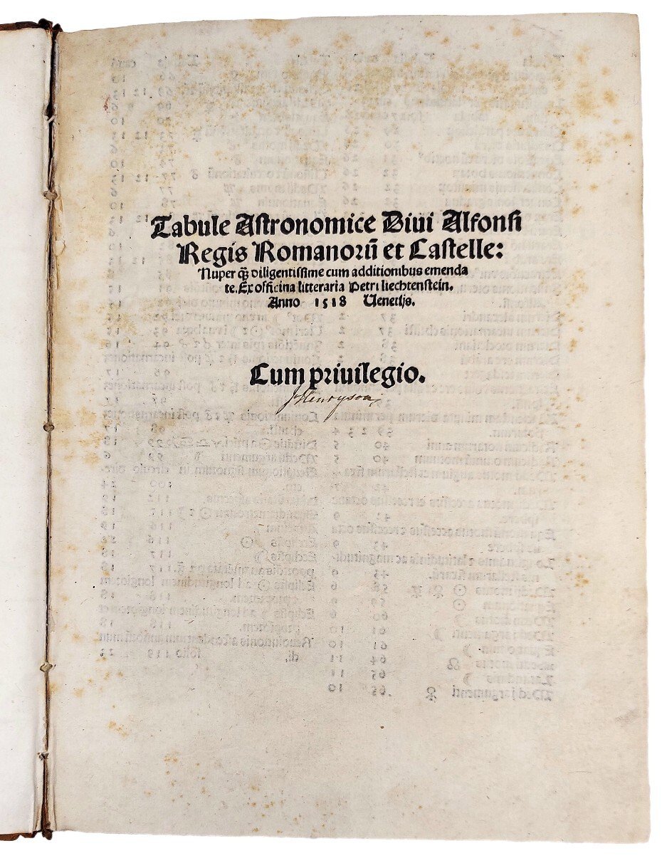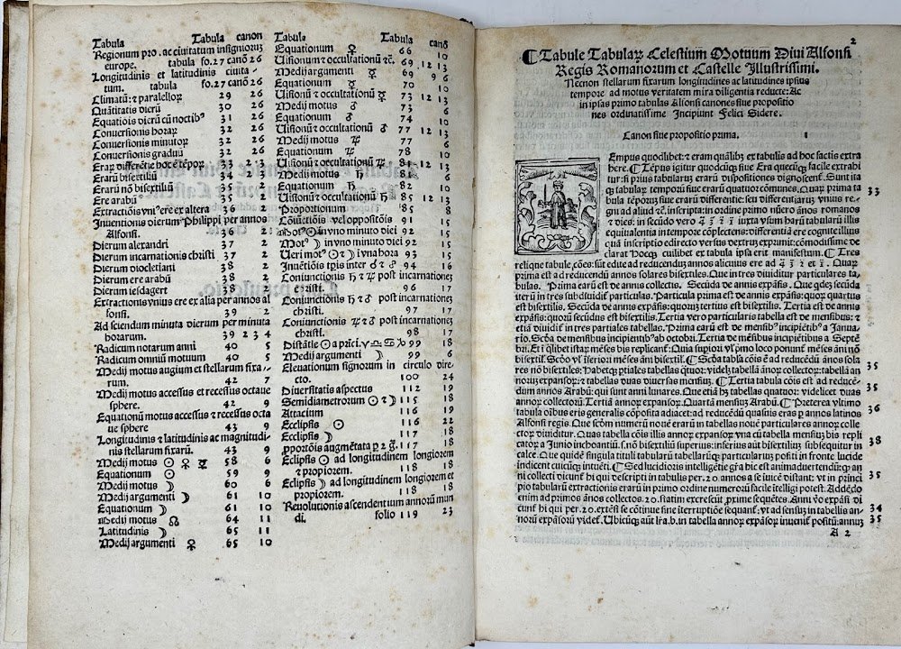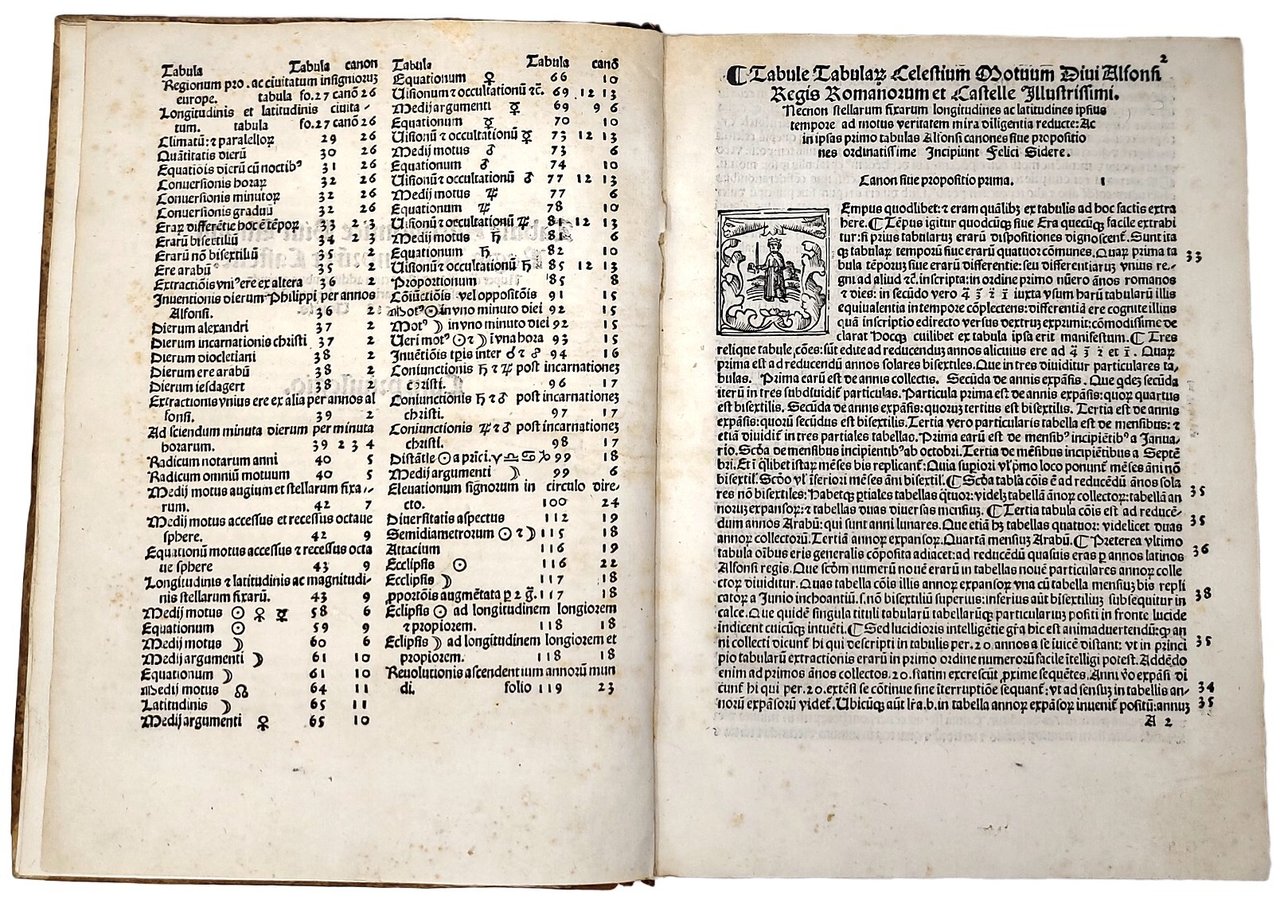 >in-4, ff. 120, legatura settecentesca in mezza pelle, titolo e filetti oro al dorso. Testo in carattere semigotico, numerose grandi iniziali ornate e istoriate su fondo nero, in fine magnifica impresa tipografica a piena pagina con tre sfere armillari, impressa a due colori. Importante e rara edizione di queste celebri tavole astronomiche (''Coelestium motuum tabulae'') fatte compilare nel 1252 dal grande illuminato Re Alfonso X di Castiglia (''il Sapiente'', 1221-1284); l'autore è, secondo alcuni, l'astronomo arabo Isaac aben-Sid, e secondo altri, Isaac Hazan. Divenute famose, le ''tavole alfonsine'' furono utilizzate in tutta Europa fino al XVI secolo quale unico strumento per determinare il movimento dei corpi celesti e misurare longitudine e latitudine delle stelle fisse. Bell'esemplare. Houzeau-Lancaster II, Bibliogr. de l'Astronomie, I B n.12487. BMC 20. Cantamessa I, 103, note.