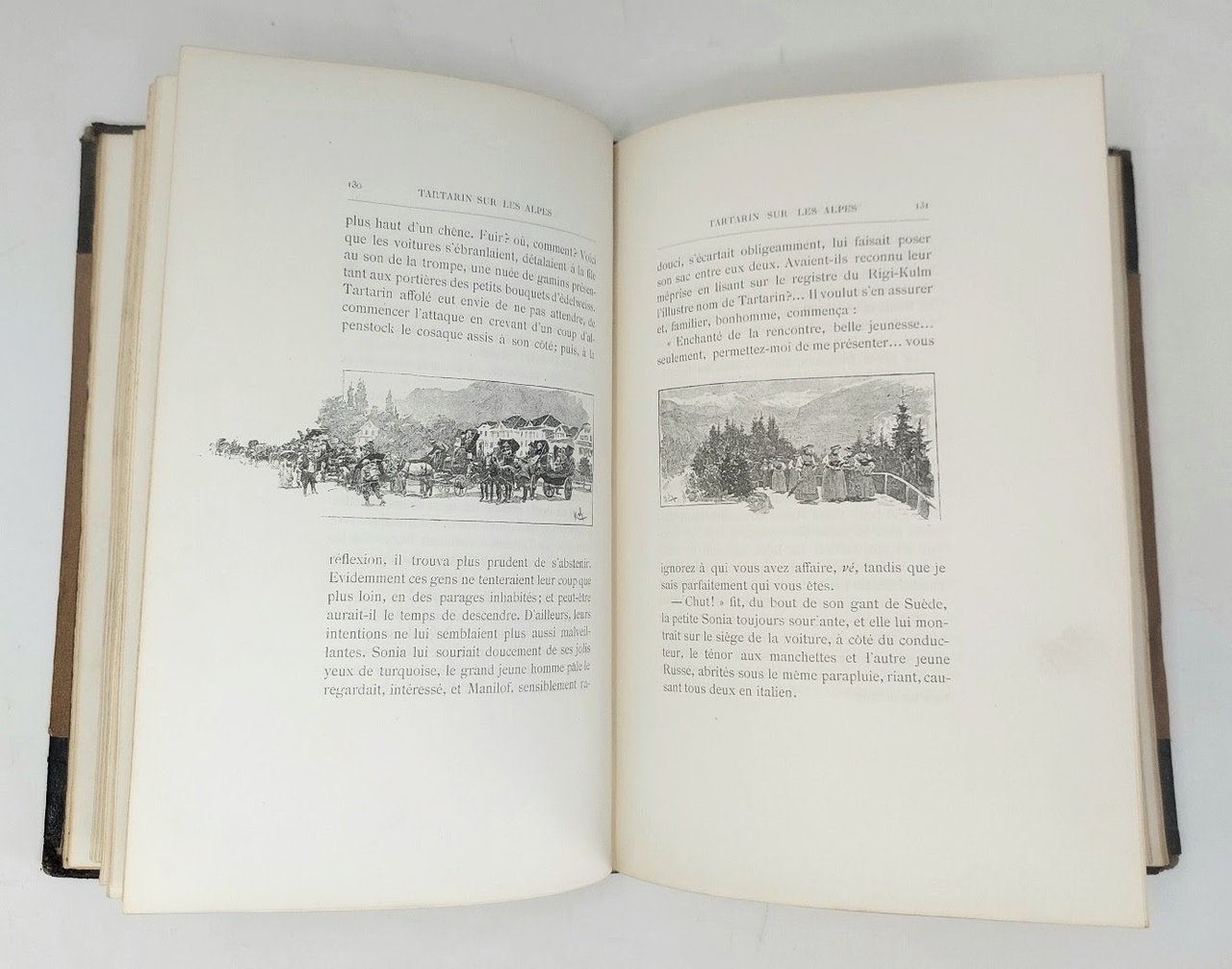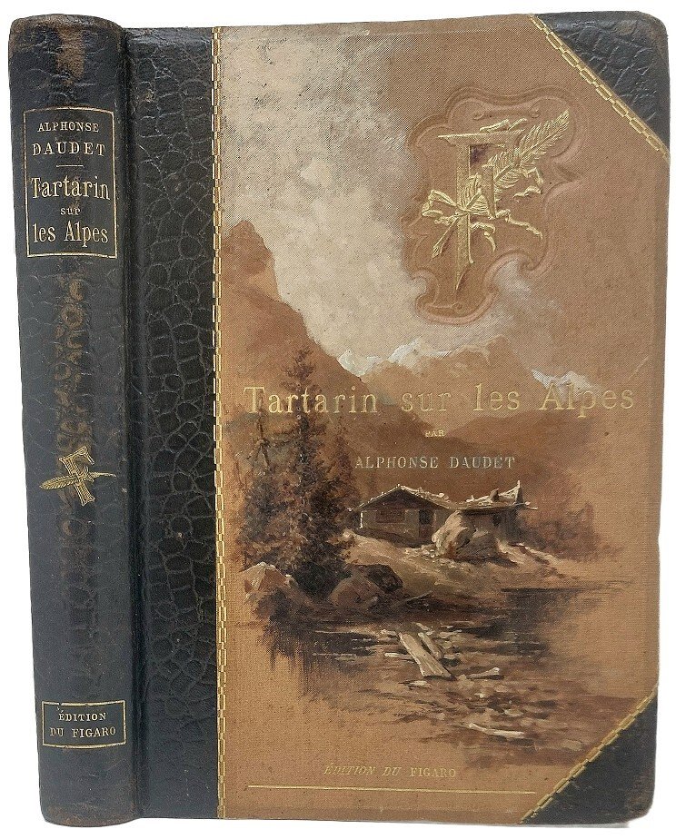 >in-8 , pp. (4), 334, (8), in legatura editoriale mezzo marocchino a grana larga e angoli, piatto anteriore in tela figurata con scena di montagna a colori, titolo in oro al dorso. Celebre e fortunato romanzo umoristico del brillante scrittore provenzale (1840-1897), intelligente satira della "inarrestabile ascesa del turismo e della frequentazione delle località alpine alla moda" (Garimoldi), osservate dal Daudet nei due viaggi in Svizzera e Savoia del 1883 e 1885. Prima edizione, seconda tiratura (identificabile, come avverte Perret, dall'aver la “justification du tirage” al verso del primo foglio prelim. e la fig. a pag. 330 non più a rovescio). Ottimo esemplare. PERRET 1216: «L'édition originale est recherchée». ACL 83. MATHEWS 302. GARIMOLDI n. 100.