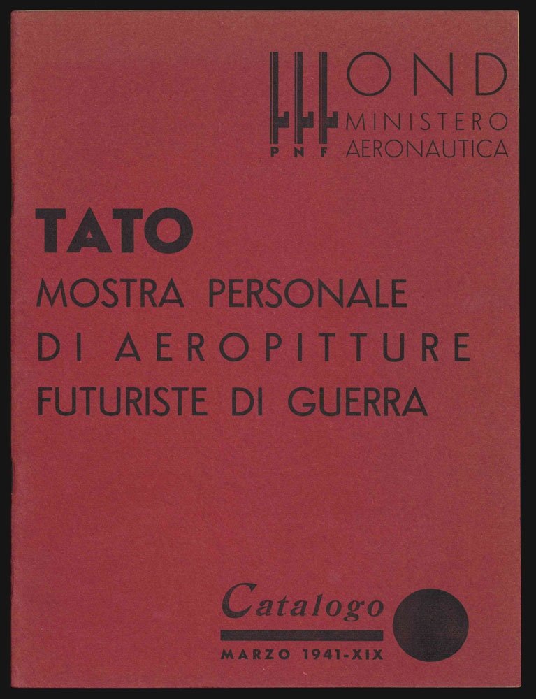 LIBROCatalogo originale.Ottimo esemplare (minime abrasioni al dorso).Piuttosto raro, solo quattro esemplari in Iccu (manca ad Apice), e due copie in Oclc (Beinecke e Mart).Mostra tenutasi nel marzo 1941 al dopolavoro del Ministero dell’Aeronautica militare: 70 aeropitture e 16 «Umorismi feroci», caricature politico-belliche. Contiene: una presentazione PNF - OND Ministero Aeronautica, firmata Il Commissario; una Lettera di Tato a Marinetti; uno scritto di Giuseppe Galassi (.bolognese, invece); giudizi di vari su Tato (C. Tridenti, Marinetti, U. Notari, U. Ojetti etc.); uno scritto di Marinetti (Aeropittura di guerra); 15 splendide riproduzioni delle aeropitture di guerra a pagina intera. Notevole layout futurista.Bibl. Nuovi archivi del futurismo, I, 1941/5.