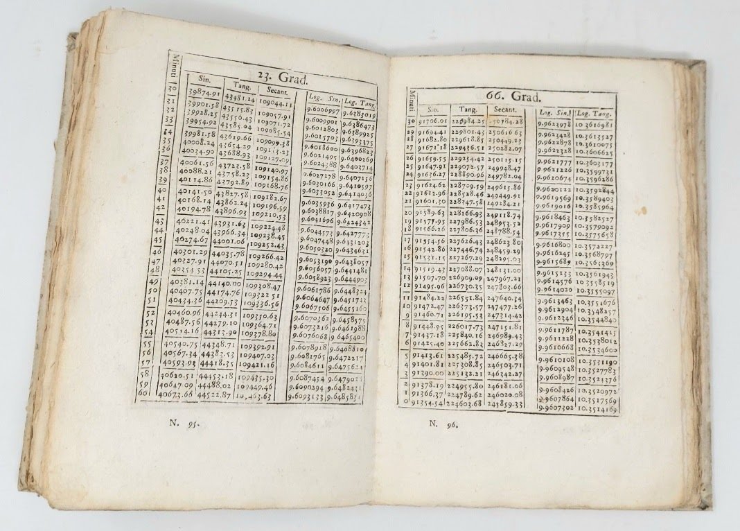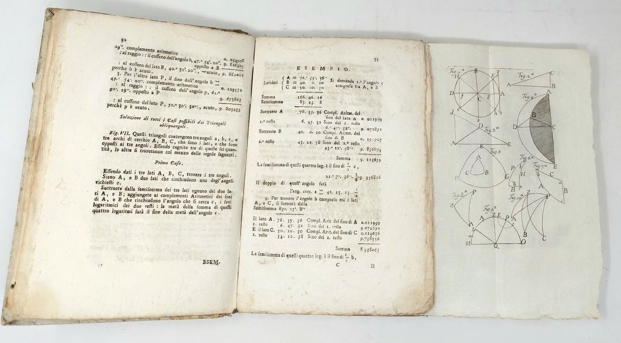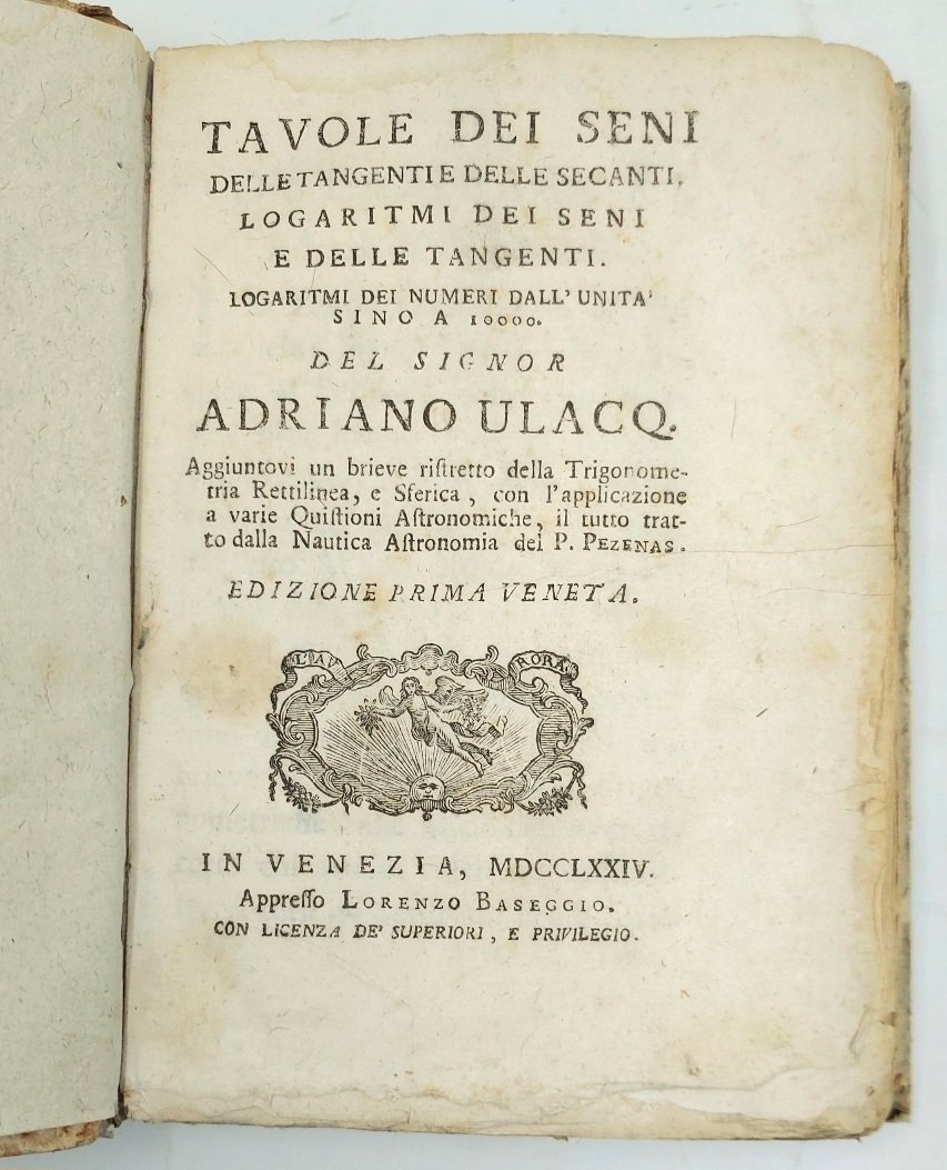 >in-8 (187x130 mm), pp. 64 di testo, pp. 284 di tabelle ''Canoni dei seni delle tangenti, delle secanti e dei logaritmi per li seni e per le tangenti''. Una tavola tecnica ripiegata f.t. Legatura originale in cartonato rustico (dorso anticamente rinforzato). Prima edizione italiana di raro trattato di trigonometria e astronomia. L'edizione latina fu edita un paio di volte negli anni precedenti del secolo XVIII. Matematico e libraio olandese, Vlacq è celebre per aver calcolato i logaritmi dei numeri tra 20.000 e 90.000 contribuendo agli avanzamenti nell'ambito della trigonometria piana e sferica. Un cratere lunare è stato battezzato Vlack in suo onore. Buon esemplare, in barbe, lievi aloni d'umido sparsi. Brunet, V, 1003.