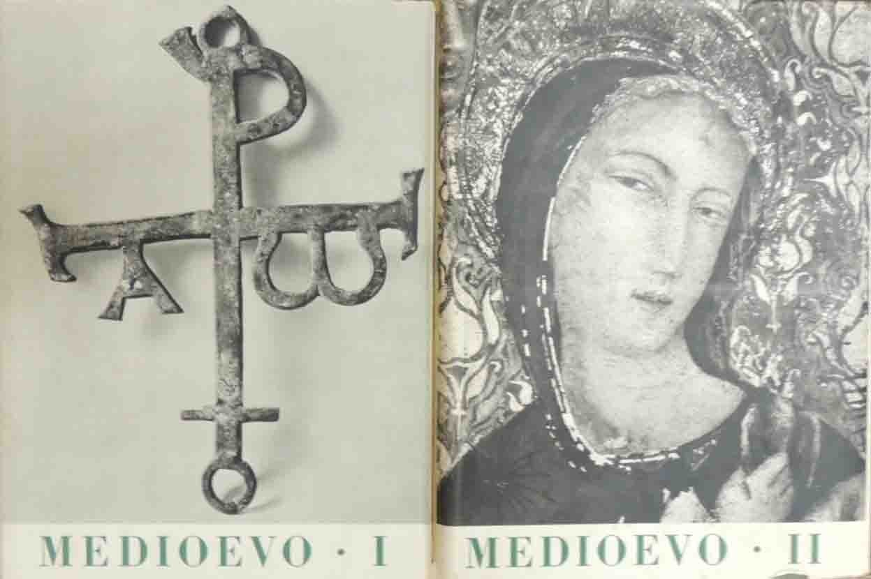 Eva Tea, Medioevo, Unione Tipografico-Editrice Torinese, s.l. (ma stampato a Torino, presso la Tipografia Sociale Torinese) 1957, 2 voll., pp. XVI, 1434, ill. b.n., XIV c. di tavv. f.t. ill. b.n., cm 27, legatura in tela ed. con titoli in oro al dorso e al piatto, sovraccoperta e cofanetto muto in cartoncino ed. Collana Storia Universale dell’Arte. Volume terzo. Tracce d’uso alle sovraccoperte, con strappetti e qualche piccola mancanza, fioriture, sporadici segnetti di pastello a margine, per il resto buone copie.