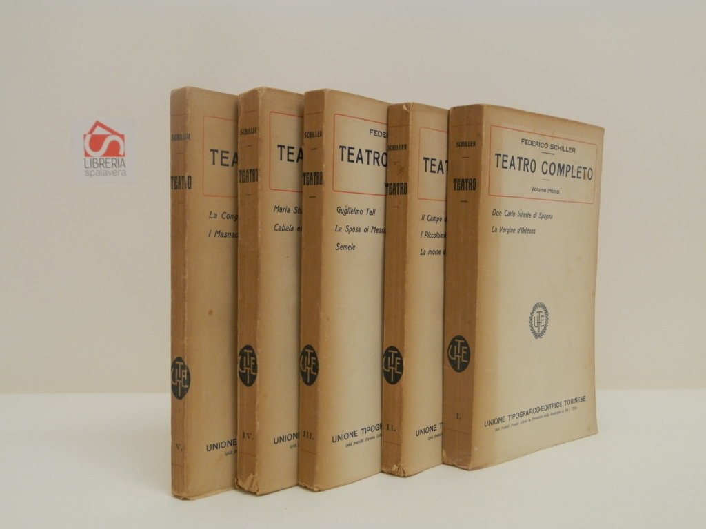5 volumi, 16°, pp. 332; 296; 229; 248; 247; brossura editoriale, titolo al piatto e dorso. Opere: Don Carlo Infante di Spagna, La Vergine d'Orleans; Il Campo del Wallenstein; I Piccolomini; La morte del Wallenstein; Guglielmo Tell; La Sposa di Messina; Semele; Maria Stuarda, Cabala ed Amore; La congiura del Fiesco; I masnadieri. I Volumi sono intonsi, a parte il quarto e parte del quinto. Qualche brunutira sparsa esemplare nel complesso molto buono. *** TUTTI I NOSTRI LIBRI SONO VISIBILI PREVIO CONTATTO MAIL O TELEFONO NELLA NUOVA SEDE DI MILANO: LIBRERIA COSMOPOLIS, VIA JOMMELLI, 22. ***