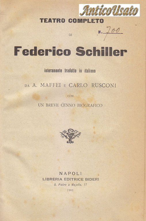 TEATRO COMPLETO di Federico Schiller 1901 Bideri traduzione Maffei Rusconi Libro