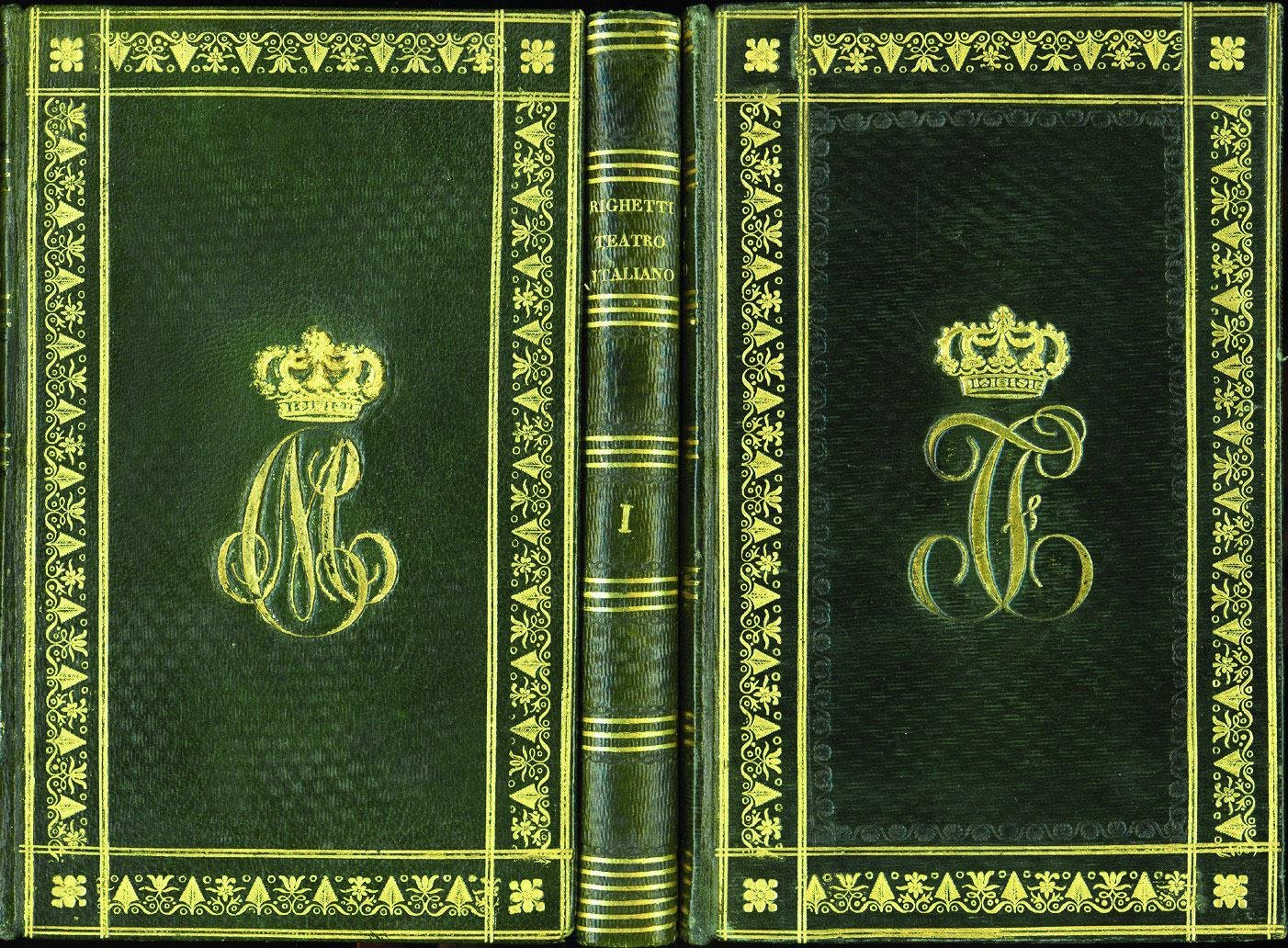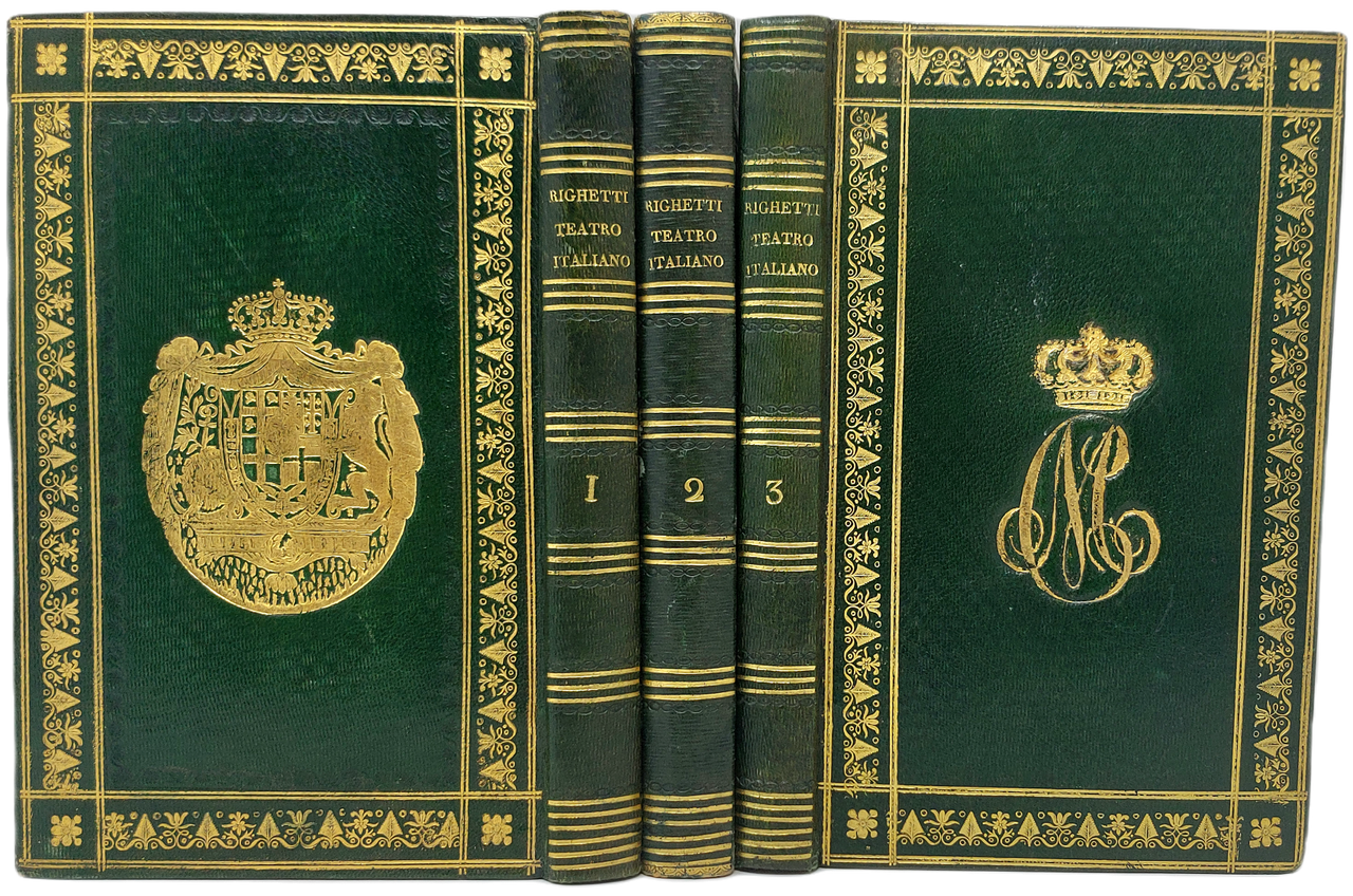 >3 volumi in-8 (203x132mm), pp.XXVIII, 239; 248, (2); 209, (2); stupende legature del tempo in pieno marocchino verde scuro finemente decorate ai piccoli ferri in oro: bordura sui piatti formata da doppio filetto che racchiude una striscia di fregi a foglie e fiori, dorsi lisci con filetti e titoli, tagli dor. Al centro dei piatti anteriori dei tomi I e II è impresso il grande monogramma CF coronato di Carlo Felice Re di Sardegna (dal 1821 al 1831); al centro del tomo III è impresso il monogramma coronato di Maria Cristina di Borbone sua sposa, al centro del secondo piatto dei tre vol. figura il grande stemma araldico di Casa Savoia. Fr. Righetti (1770-1828) fu valente letterato e attore, con esperienze in varie compagnie e poi ''caratterista'' e promiscuo nella Compagnia Reale Sarda, ivi soprannominato Righettone, sino alla sua morte. Lasciò la presente stimata opera in tre vol., nel primo dei quali è tradotta e adattata la ''Storia del Teatro'' di Luigi Riccoboni, nel secondo vi è il saggio ''Stato attuale del Teatrio Italiano'', il terzo contiene uno ''Studio sull'arte della declamazione teatrale''. Opera impressa con gran cura su carta forte. Esemplare di eccezionale bellezza in artistica legatura coeva, di assoluta freschezza. Rasi, Comici, II, 358. Rasi, Racc. Teatrale, p.495. Encicl. Spettacolo, VIII, 986. Treccani vol.XXIX.