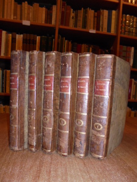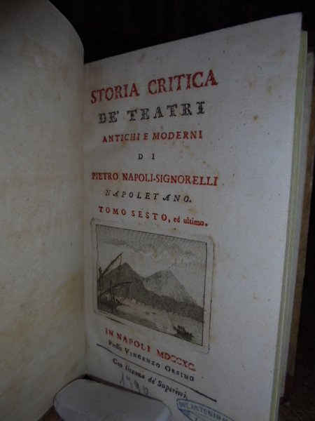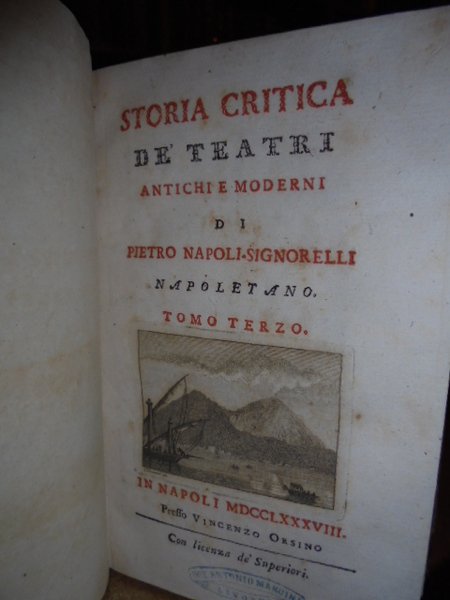 NAPOLI - SIGNORELLI, Pietro. Napoli, Vincenzo Orsino, 1787 - 1790. Storia critica de' teatri antichi e moderni. 6 volumi in - 8°, m. pelle coeva con angoli, dorsi con tassello, titolo e decorazioni in oro. Complessive 1876 pp. Frontespizi stampati in rosso e nero con vignette al centro incise in rame. Seconda e più completa edizione di quest' opera notevole. L' autore (1731 - 1815), napoletano scrisse numerose opere di interesse letterario. Ottimo esemplare. Uff. mob. 8