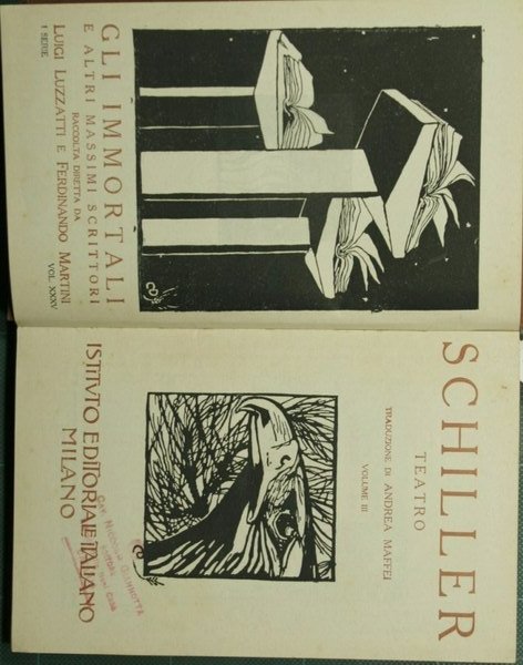 Traduzione di Andrea Maffei - Collana Gli immortali e altri massimi scrittori. I serie, n. 35 - in 16° - pp.321 - Tela con titolo e fregi in oro al dorso - Illustrazioni a colori alle sguardie e in b/n fuori testo - Contiene: I masnadieri. Cabala ed amore