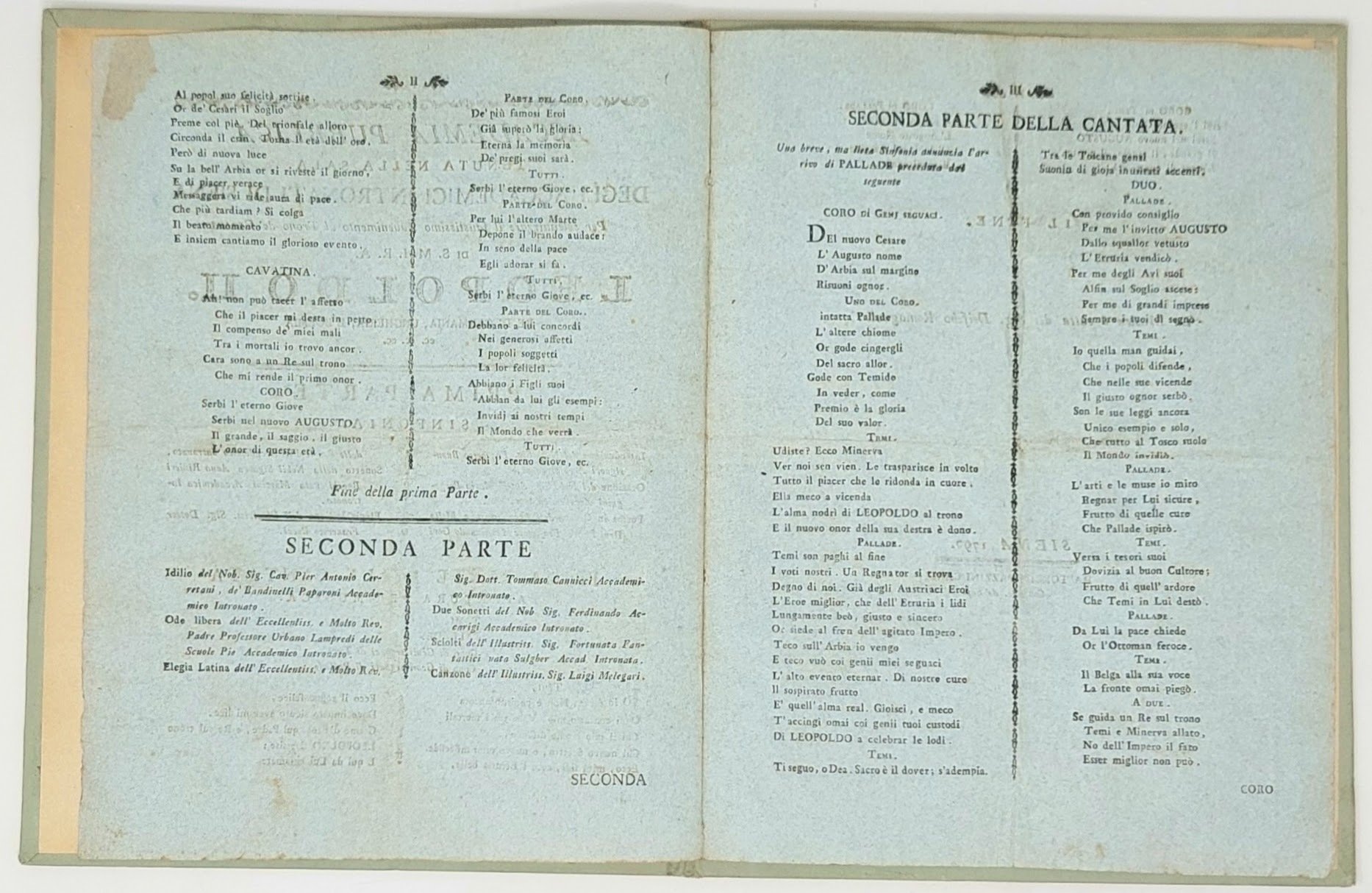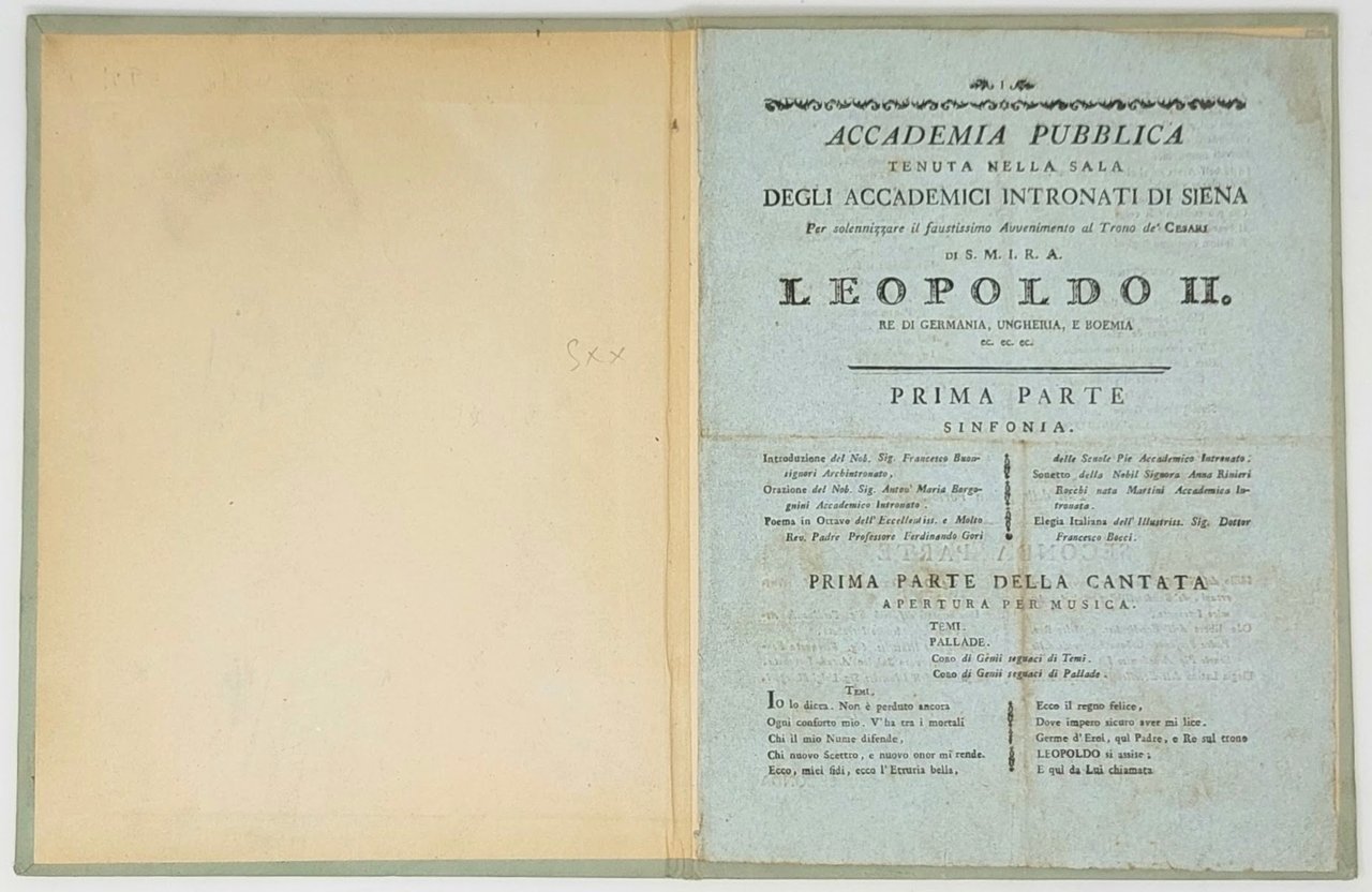 >in-4 (mm 260x195), pp. IV, impresse su carta azzurra; legatura cartone posteriore. Le quattro pagine, impresse su pregiata carta azzurra, contengono il testo delle due parti dei componimenti poetici della ''Cantata'' e il relativo autore. In fine si avverte che la musica è tutta del compositore Deifebo Romagnoli (Siena, 1765 – Siena, 1813) , ma non è presente la notazione musicale. Nata nel 1525, l'Accademia degli Intronati così chiamati per il desiderio dei fondatori di ritirarsi dai rumori del mondo per dedicarsi alle commedie e agli studi di lingua e svariati temi di letteratura e di erudizione. Curioso cimelio della celebre Accademia senese, bell'esemplare con tracce di antiche piegature.