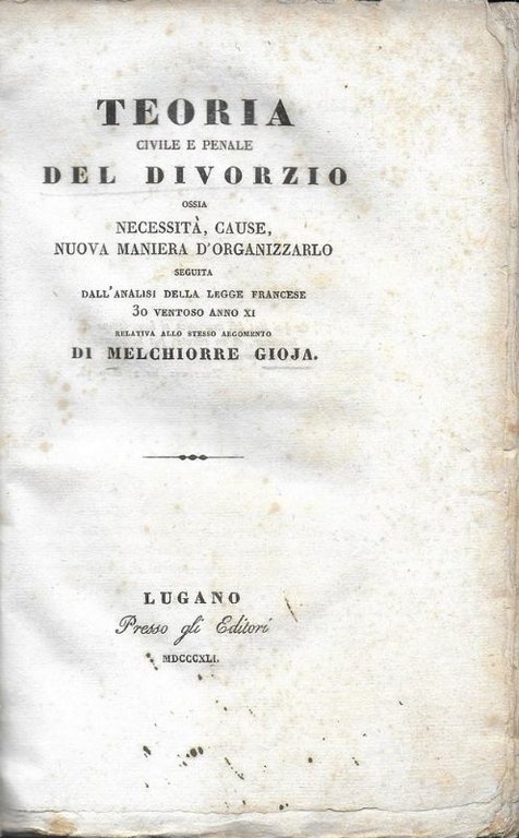 Teoria civile e penale del divorzio ossia necessità, cause, nuova maniera d'organizzarlo seguita dall'analisi della legge francese 30 ventoso anno XI.