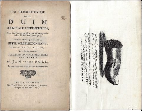Ter gedachtenisse Van den Duim des metalen gedenkbeelds, Door den Hartog van Alba voor zich opgerecht in het kasteel van Antwerpen; Voorheen in bewaringe van den heere Pieter Korneliszoon Hooft, Drossaert van Muiden, Nu in eigendom van den weledelen grootagtbaren heere den heere Mr. Jan van den Poll, Burgemeester der Stadt Amsteldam.