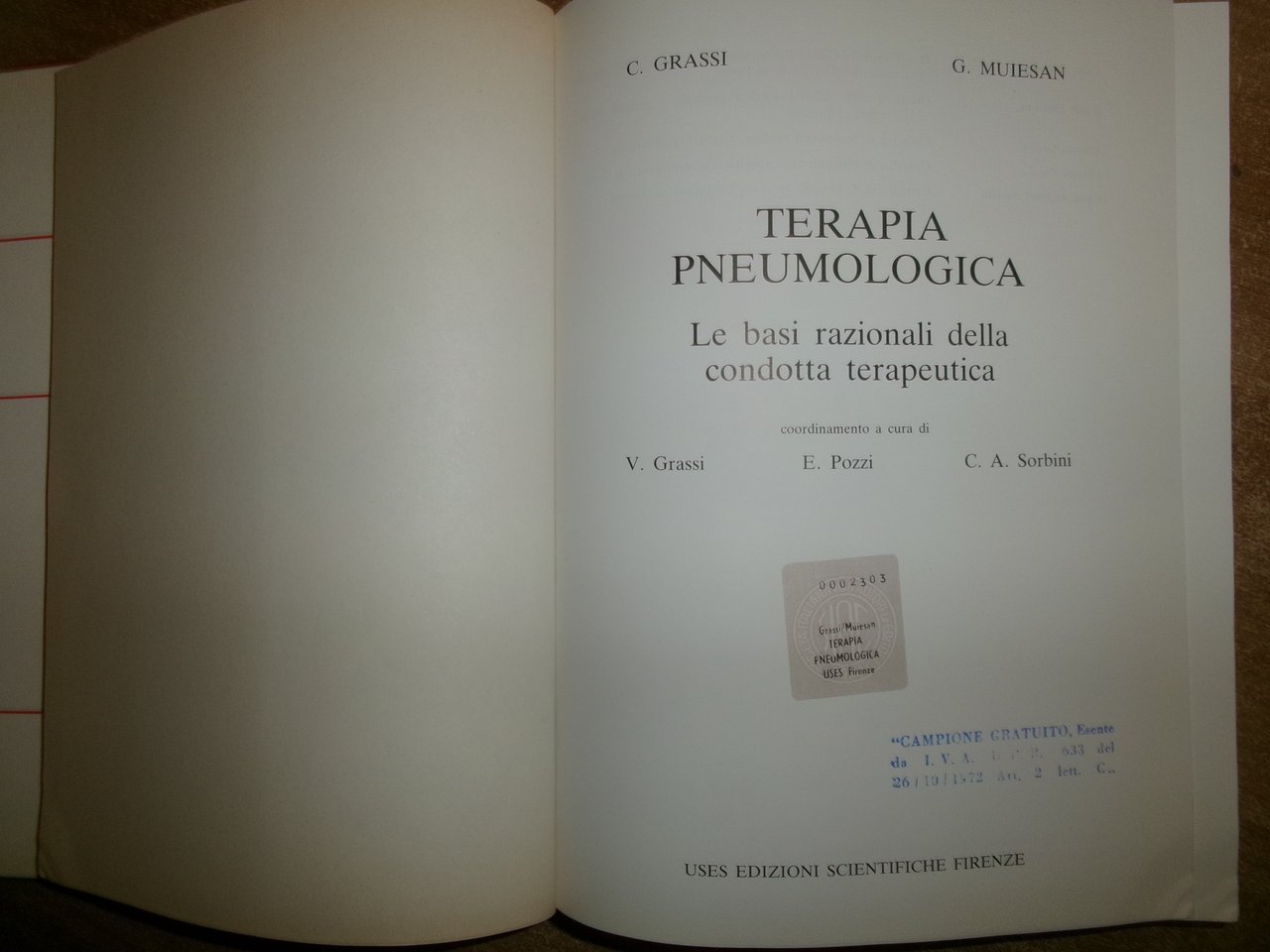 C. GRASSI - G. MUIESAN. Firenze, USES Edizioni Scientifiche, 1987. TERAPIA PNEUMOLOGICA. Le basi razionali della condotta terapeutica. Coordinamento a cura di V. Grassi E. Pozzi C. A. Sorbini. In-8°, tela rossa con sovracopertina. xvi, 509 pp. con numerose figure in nero n.t. Ottimo stato. Uff. C - IV - 2