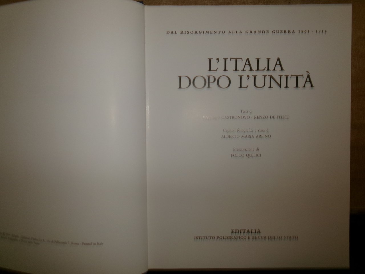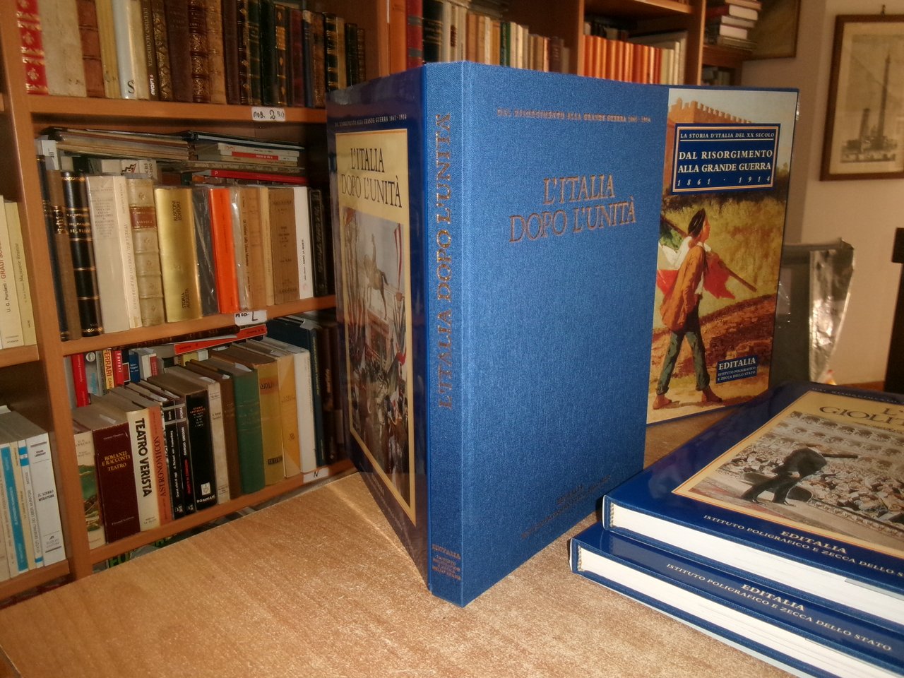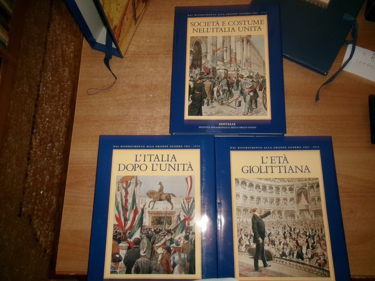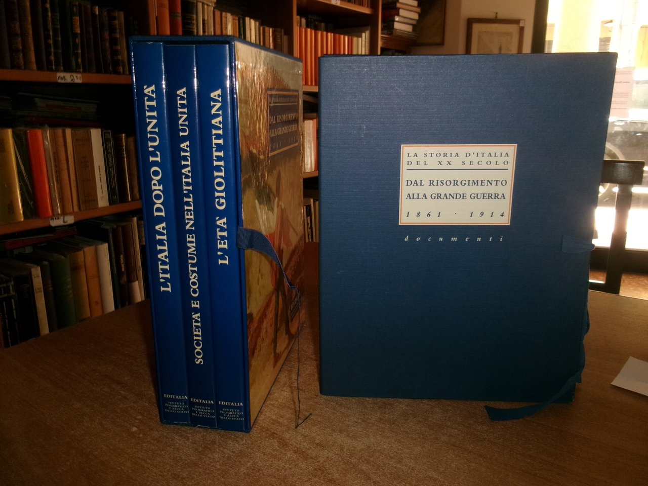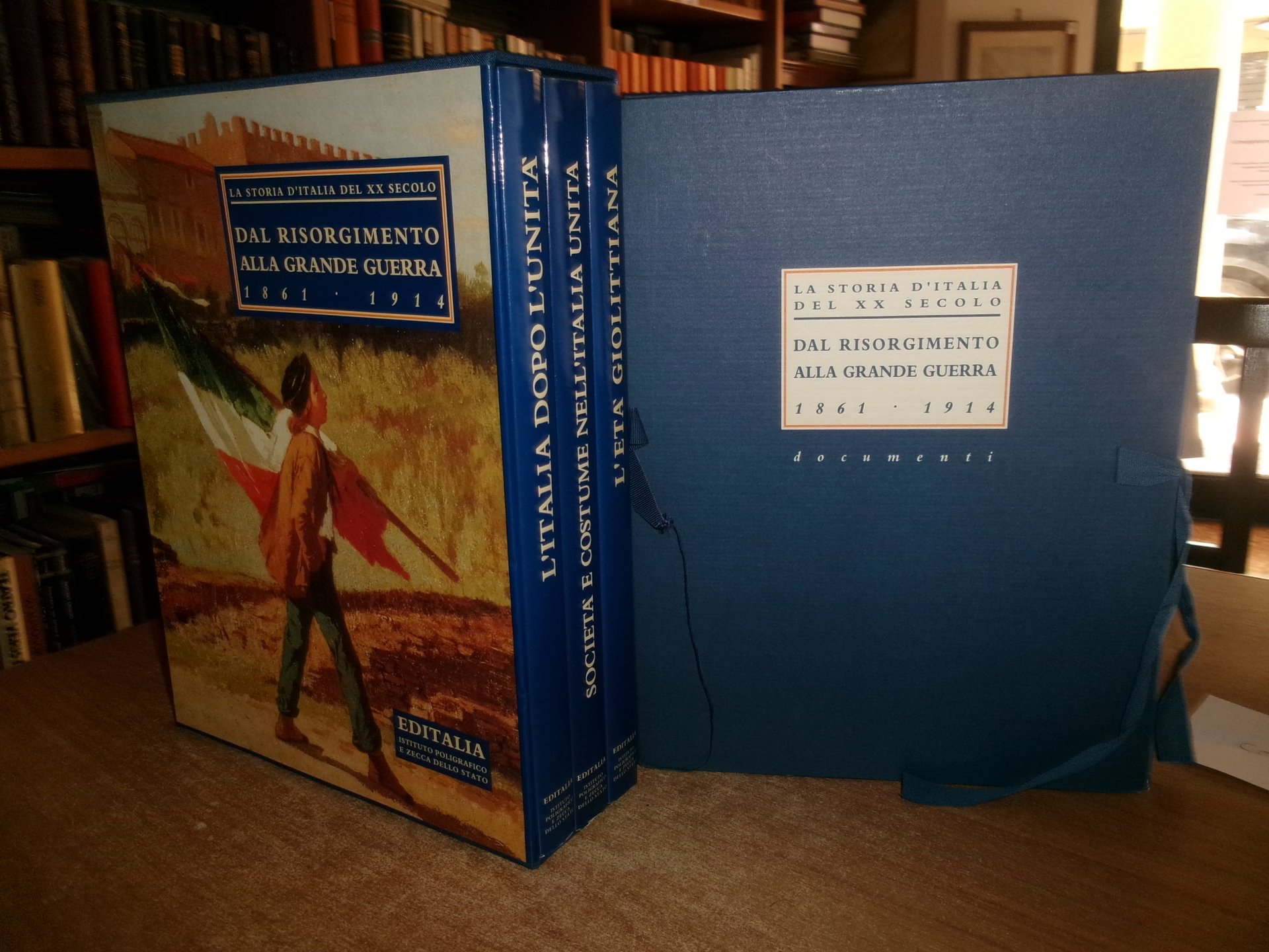 Testi di Valerio Castronovo/Pietro Scoppola. Dal Risorgimento alla Grande Guerra 1861-1914. Roma, Editalia, Ist. Pol. e Zecca dello Stato, 1994. 3 volumi in-4°, tela edit. bleu con titoli in oro e sovracopertine ill. a col. I. L' Età Giolittiana. 175 pp.; II. L' Italia dopo l' Unità. 175 pp.; III. Società e Costume nell' Italia Unita. 176 pp. Corredati da numerose illustrazioni a colori e in bianco e nero n.t + cartella in tela contenente 24 documenti. Come nuovo in cofanetto m-tela + cartella con 24 documenti. Una piccola piega all' angolo nella pagina dell' indice nel vol. "L' Italia dopo l' Unità". Neg. sport.